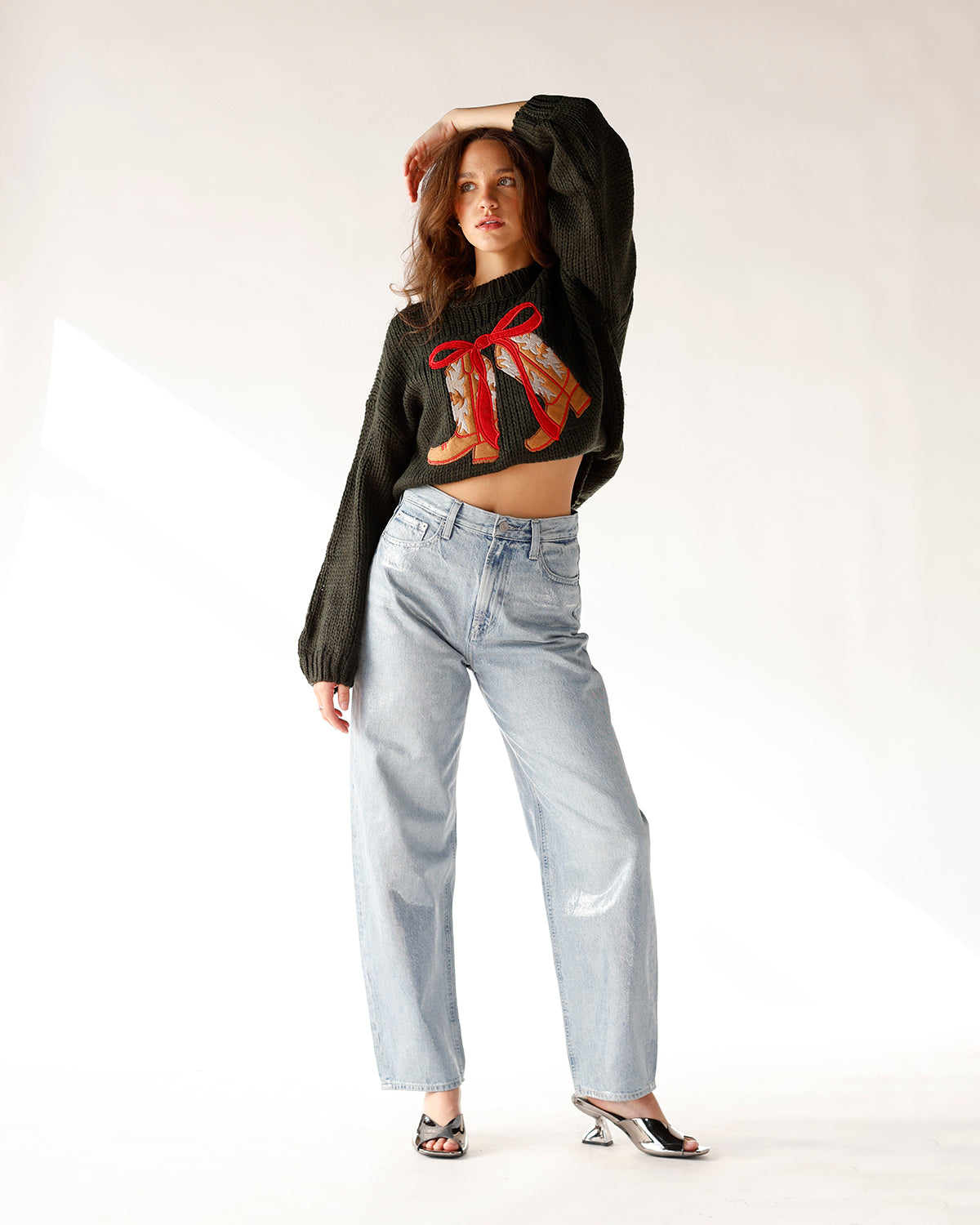 kick up some cozy charm with this cute, cowgirl inspired knit sweater. featuring a playful design of classic cowboy boots and a sweet 3d bow, this sweater mixes rustic flair with whimsical fun. soft, warm, and full of personality, it’s perfect for chilly days, coffee runs, or twirling around in style. the 3d bow adds a touch of playful texture, making this sweater feel extra special!