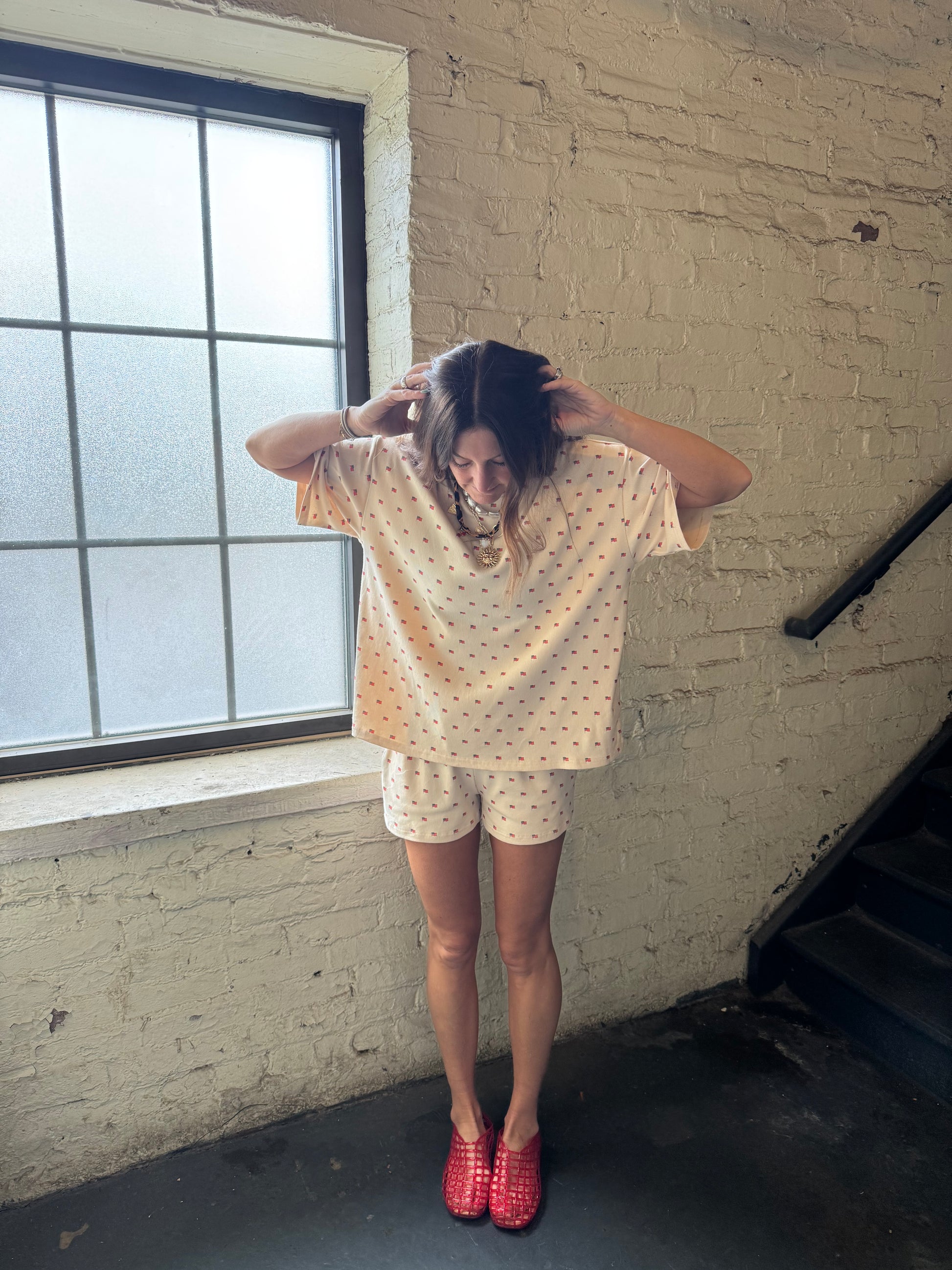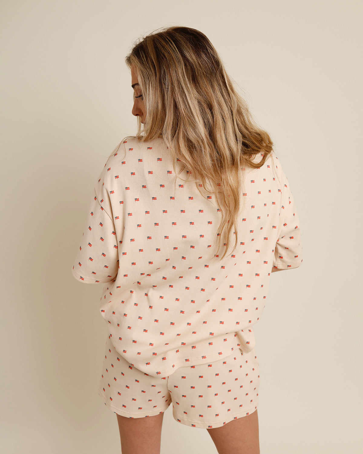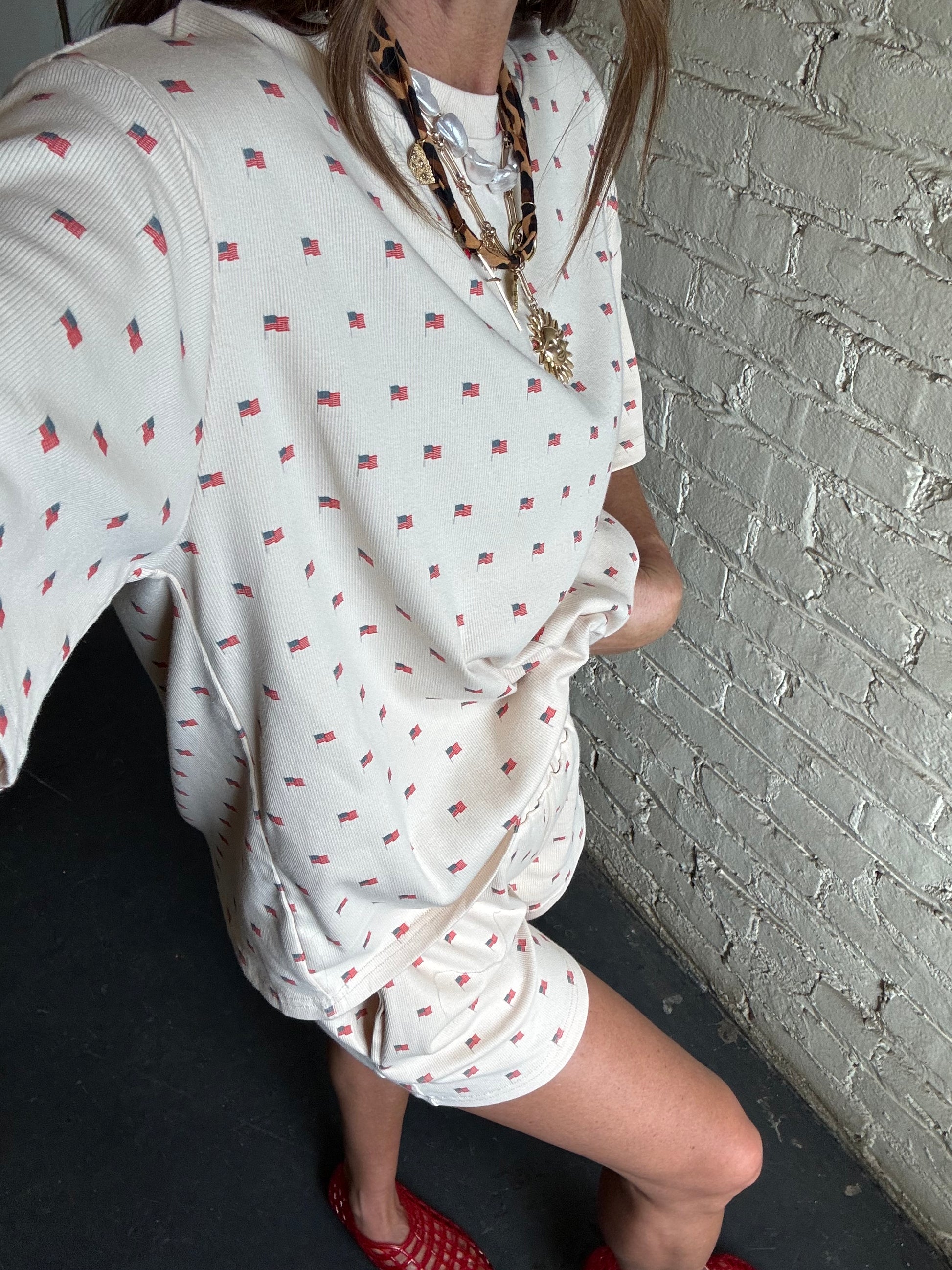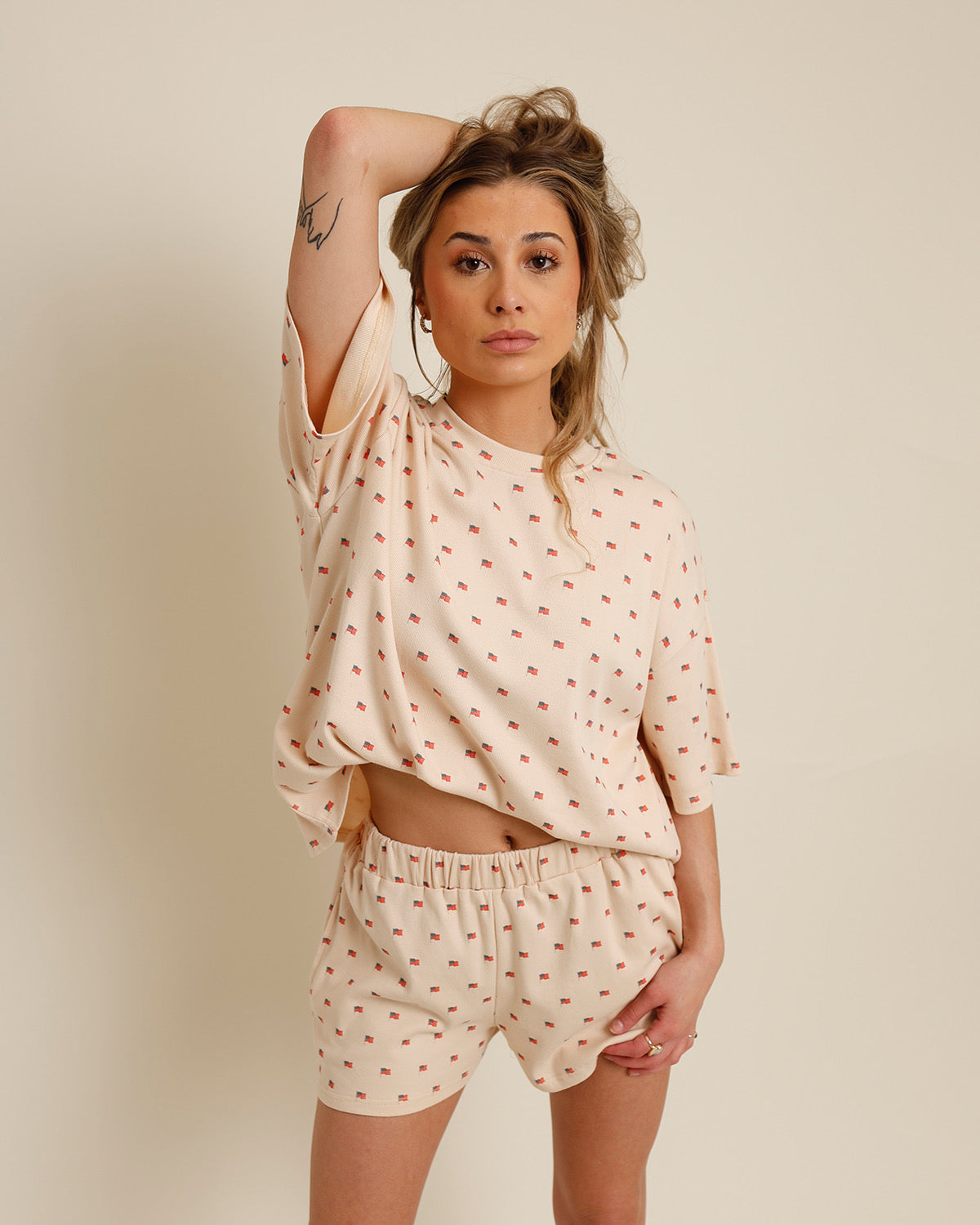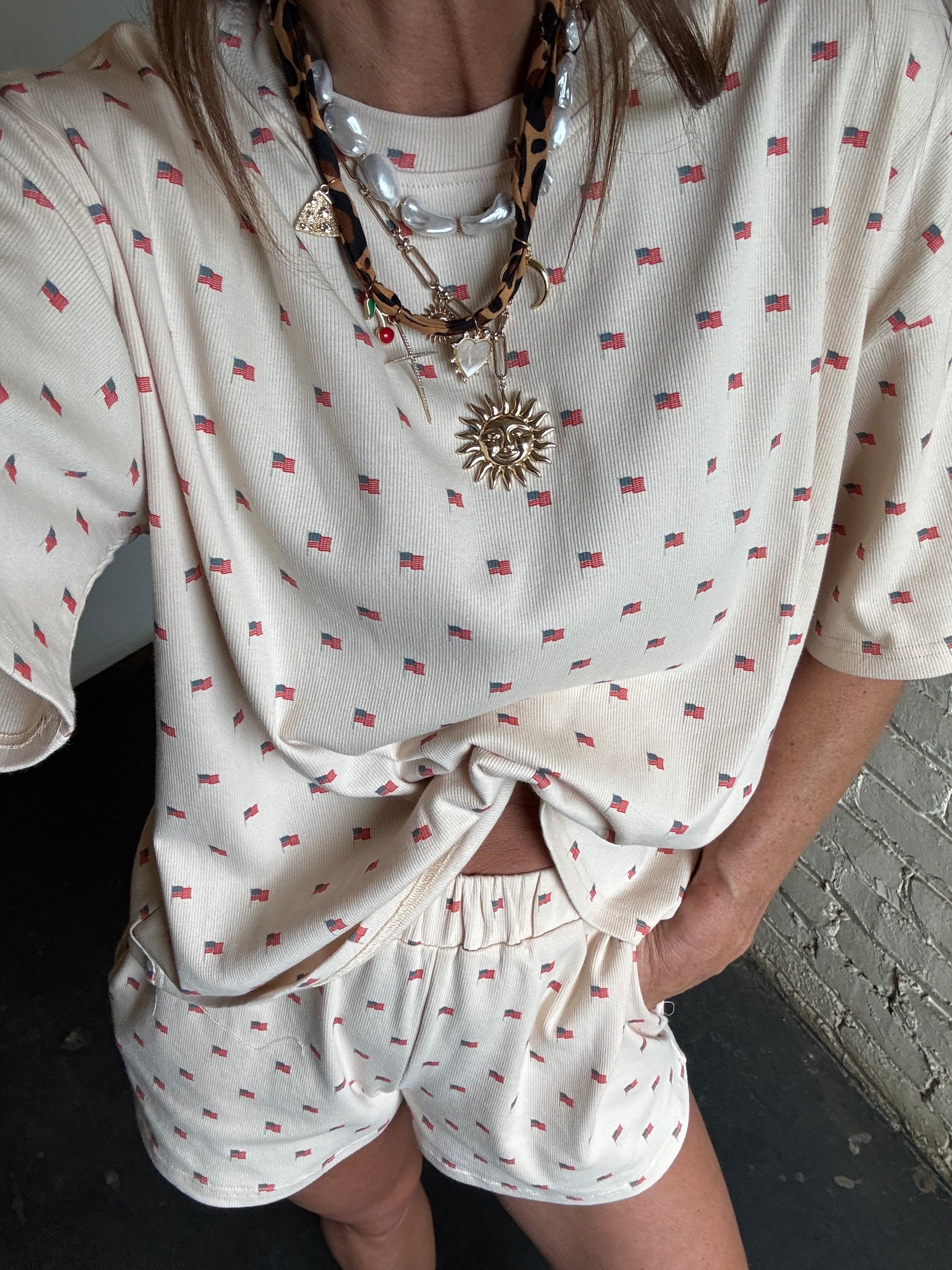 show your stars-and-stripes spirit in our party in the usa set! this playful duo features an oversized tee and breezy elastic-waist shorts both splashed with usa flags. perfect for fourth of july shenanigans, backyard cookouts, or just flaunting your patriotic vibes while staying comfy-cool. freedom never looked so fabulous or cozy!