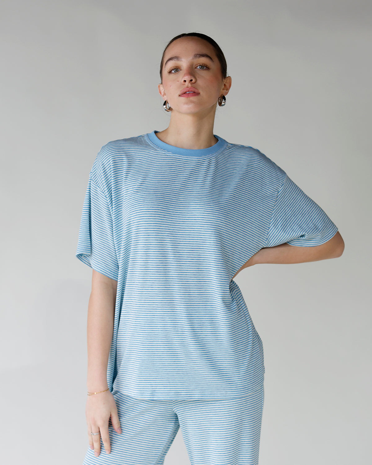 the all day, everyday short sleeve tee x blue is a spring essential from our capsule collection that you’ll reach for on repeat. designed in a blue-and-white stripe with an oversized fit, it features a soft, contrasting blue neckline for a sporty, vintage-inspired touch. blue is the color of spring, and this tee makes it effortless to lean into the season. wear it on its own with denim, skirts, or shorts, or pair it with the all day, everyday lounge pant x blue for a relaxed, coordinated look that still feels intentional. timeless, comfy, and endlessly wearable, this tee is made to be your new go-to for casual days, coffee runs, or weekend adventures 💙