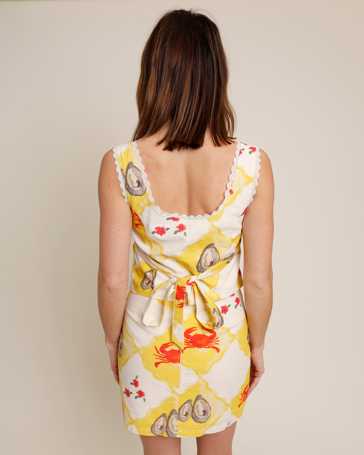 spice up your spring wardrobe with our clam bake tank! this yellow tank features a playful summer print that will add a pop of color and fun to any outfit. pair it back to the matching skirt or wear with our paloma jeans. don't miss out on this quirky and stylish top!