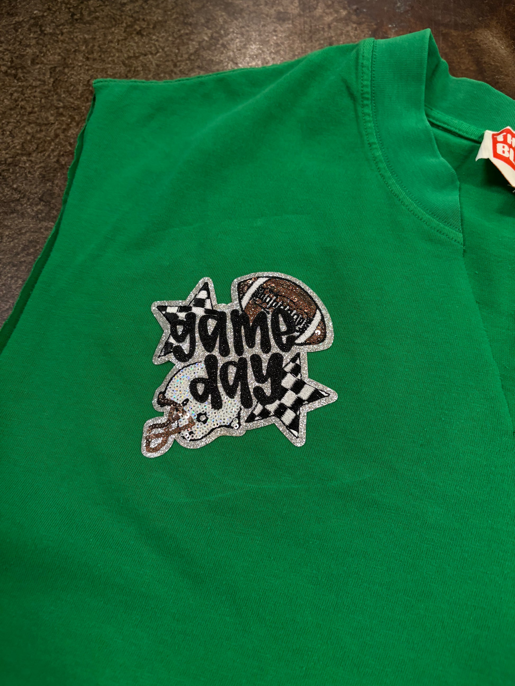 the bleacher babe x gameday muscle tee is a bold game day essential. this green tee is cut up to create a relaxed muscle style and features a slight v-cut at the neckline for a subtle twist. finished with a playful gameday patch—including checkered stars, a football helmet, and a football behind the words “game day”—it’s the perfect mix of sporty energy and herd pride. wear it cheering in the stands, tailgating with friends, or styled into your everyday wardrobe for a fun, fashion-forward touch!