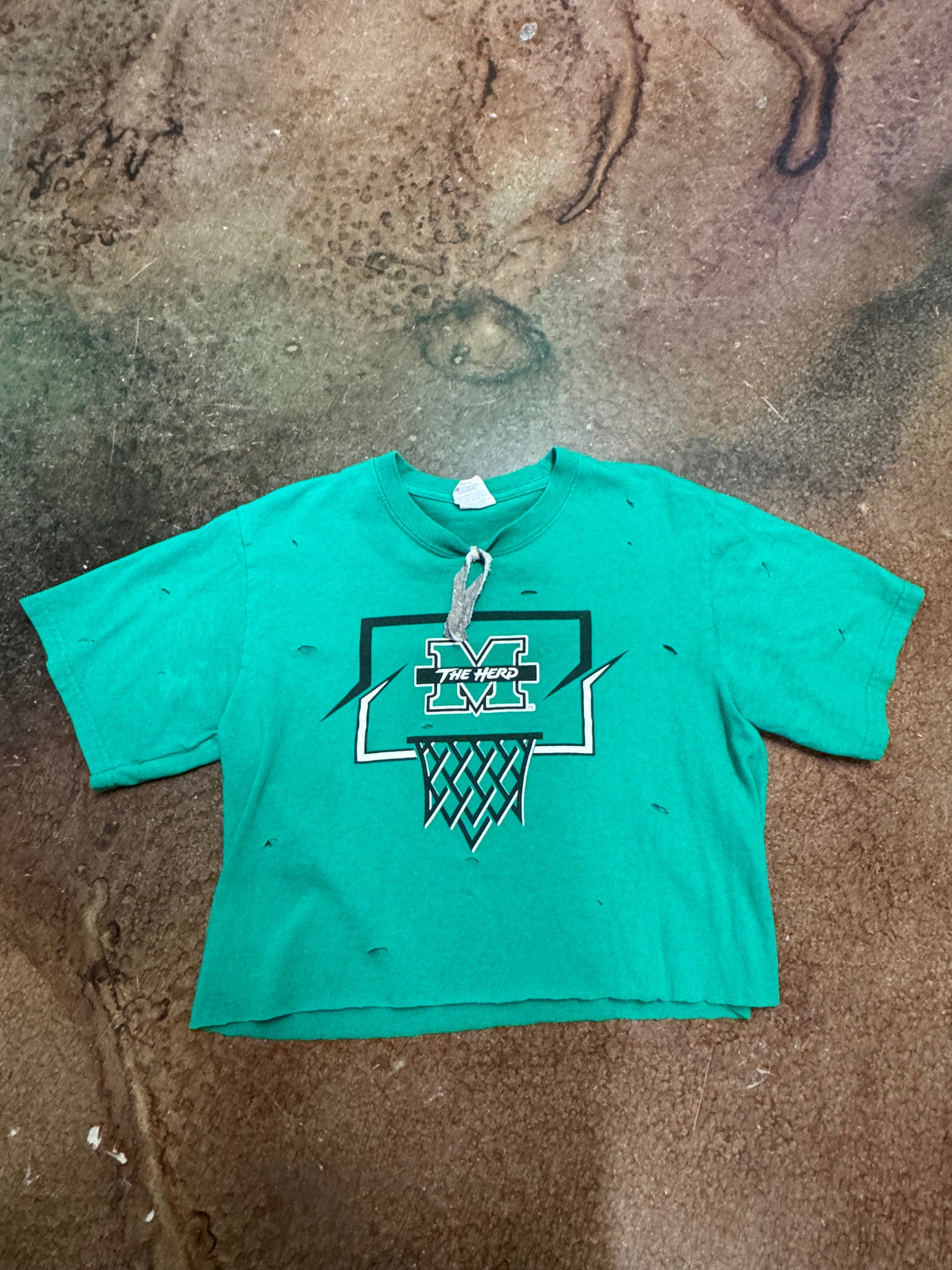 the hoops tee is a game day essential with an edgy twist. this marshall basketball cropped tee features a raw hem and distressed cut holes throughout for a lived-in, streetstyle vibe. perfect for layering or wearing solo, it’s a bold way to show off your herd pride while keeping your look playful, fashion-forward, and ready for cheering in the stands or tailgating with friends!