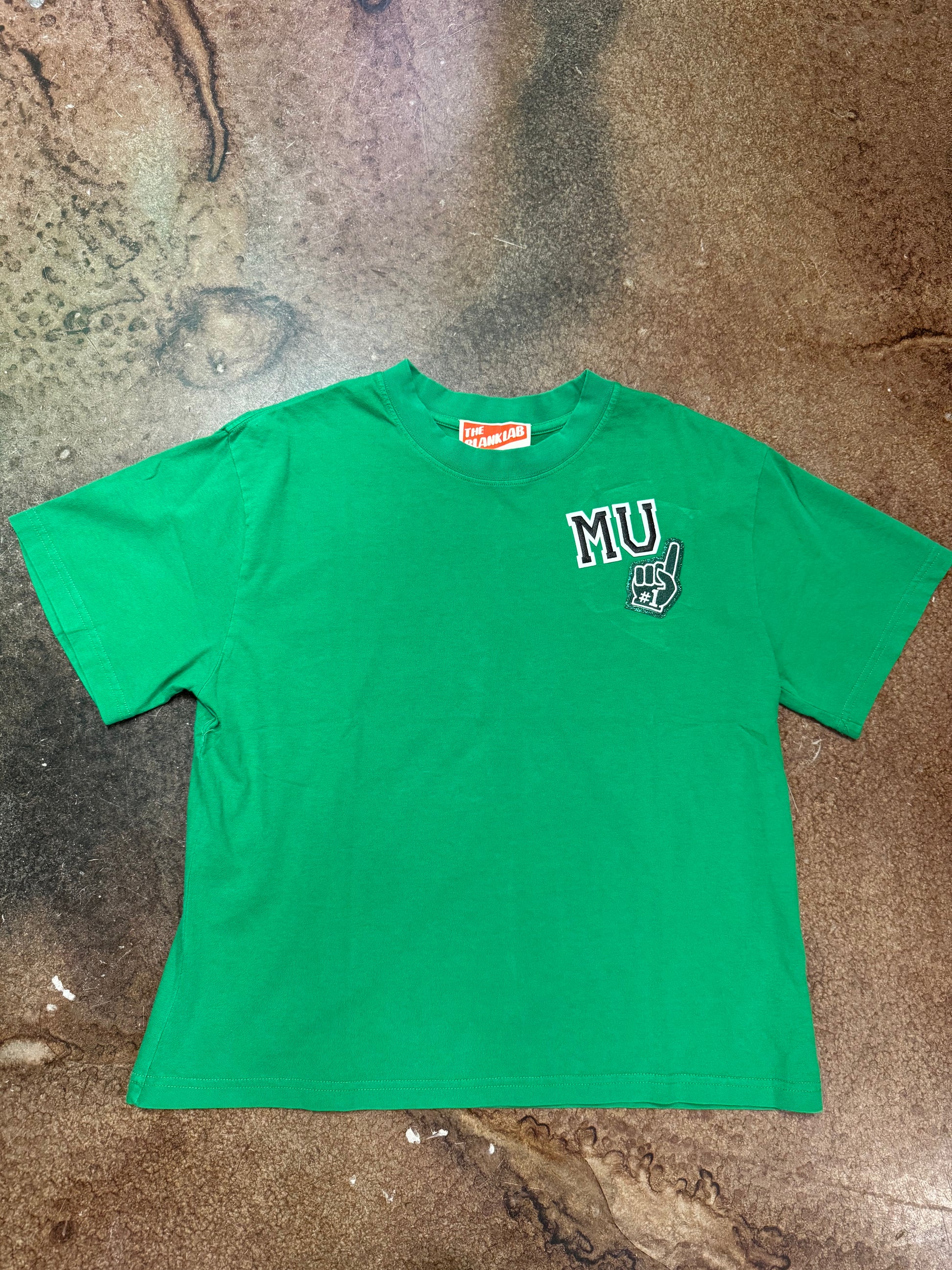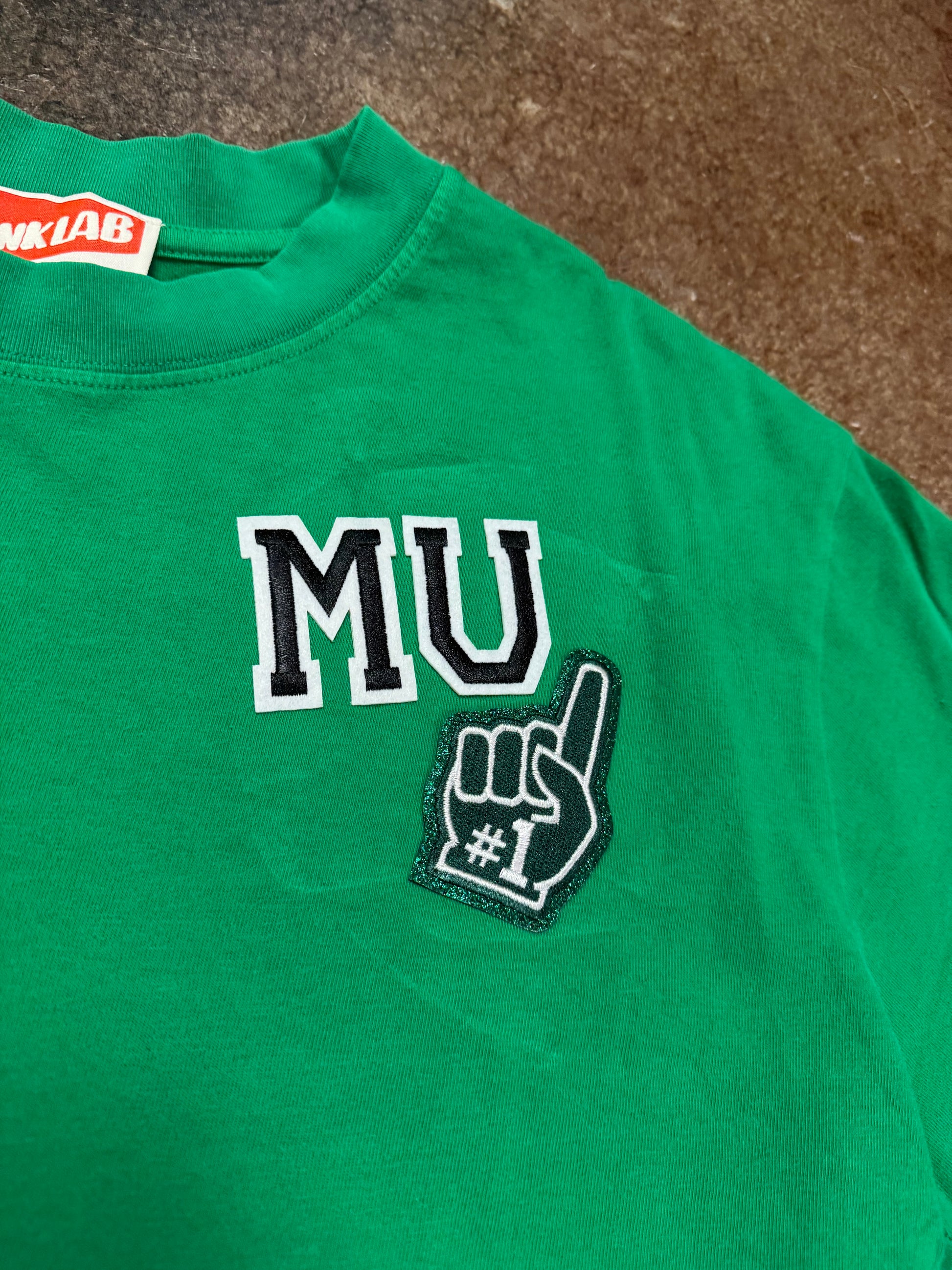 the bleacher babe x mu #1 fan tee is a game day essential with bold, playful style. this green tee features mu letter patches and a vibrant green #1 pointer finger patch on the right shoulder, creating a standout look that shows off your herd pride. the relaxed fit makes it comfortable for cheering in the stands, tailgating with friends, or adding a sporty, fashion-forward touch to your everyday wardrobe!