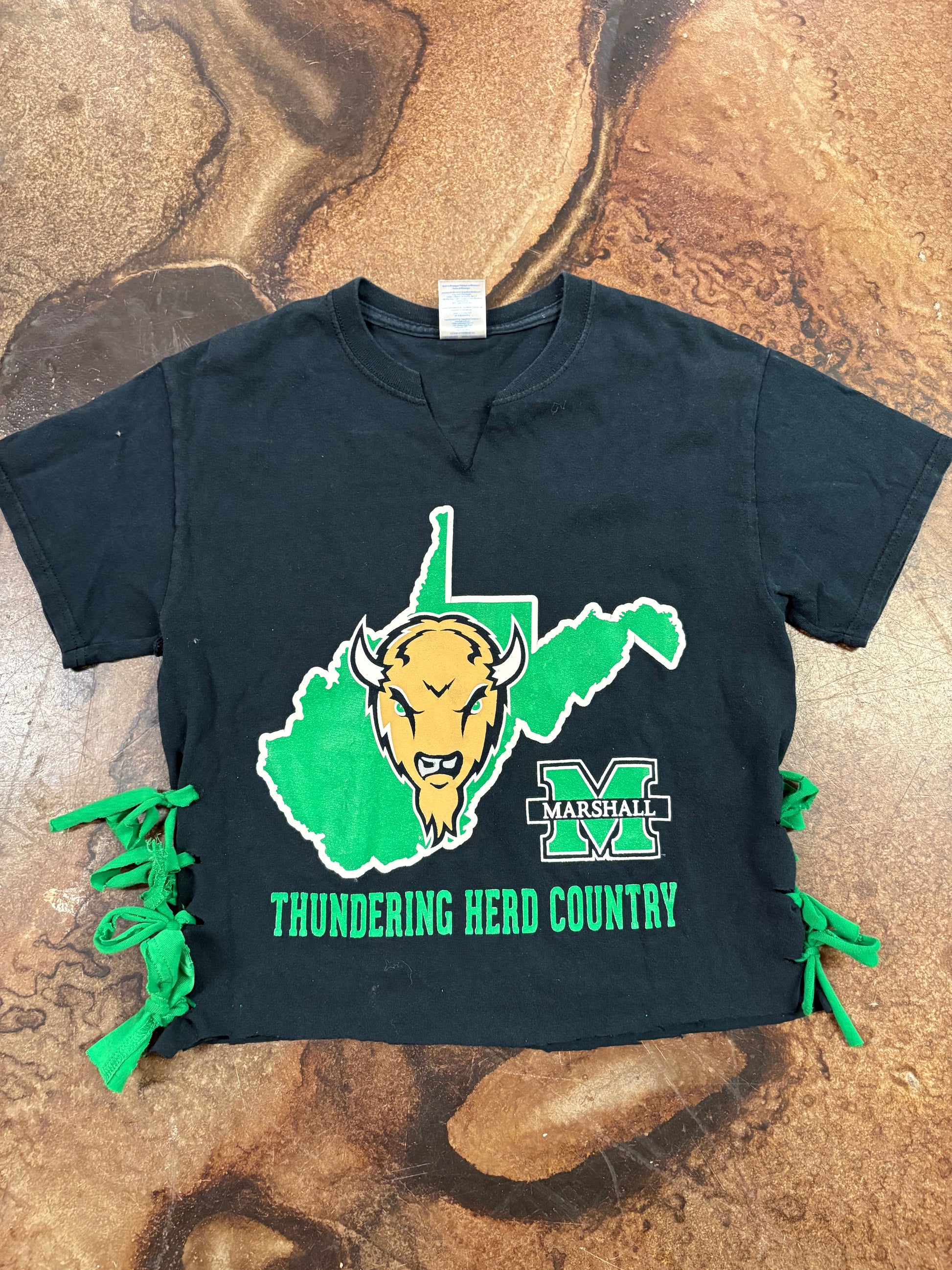 the mu country tee is a bold game day essential with playful details. this black raw hem tee features a wv & marco graphic that says “thundering herd country” and green t-shirt scrap bow ties on the sides for a unique, fashion-forward twist. perfect for cheering in the stands, tailgating with friends, or adding herd pride with an edgy, streetstyle vibe to your everyday wardrobe!