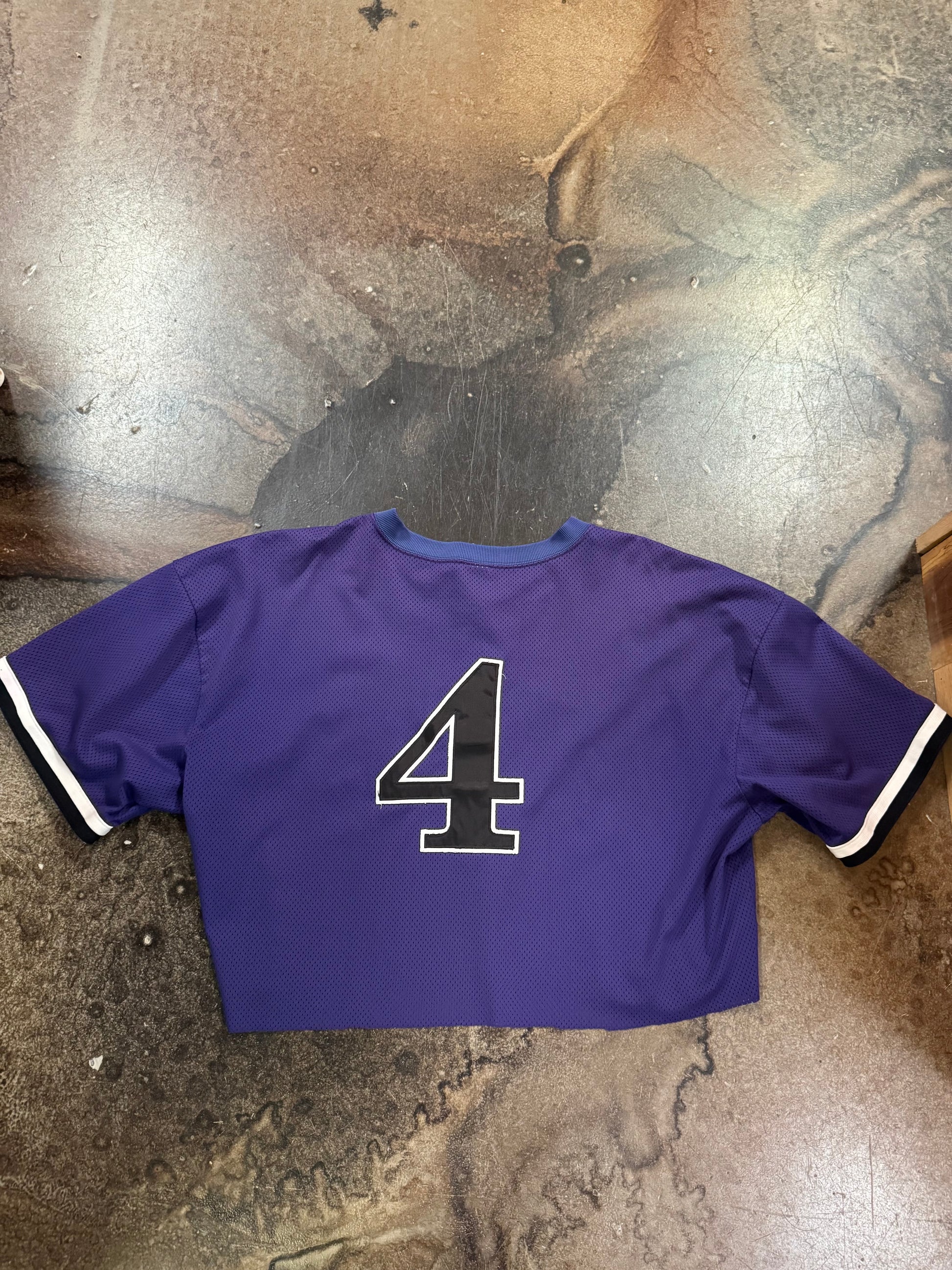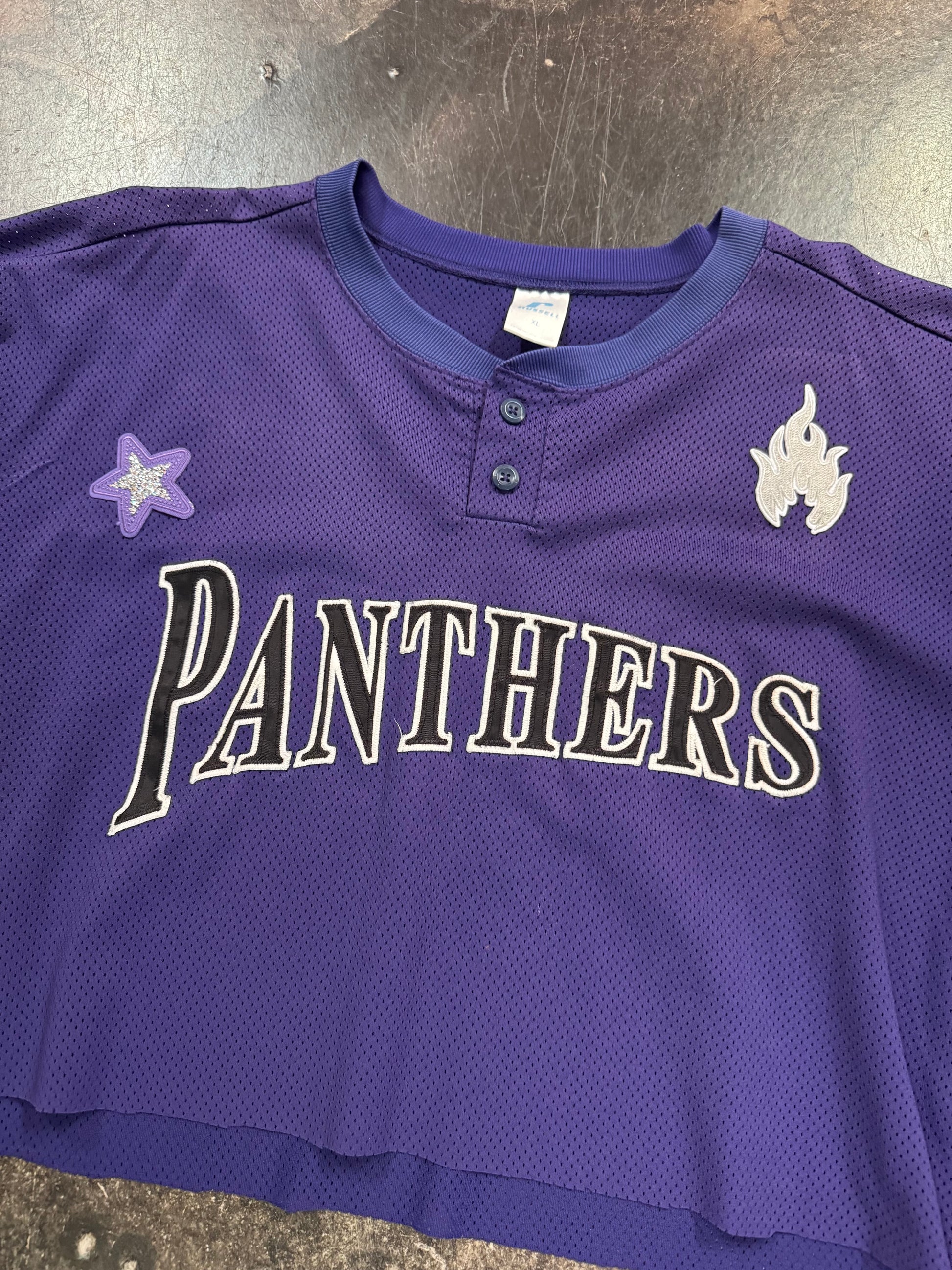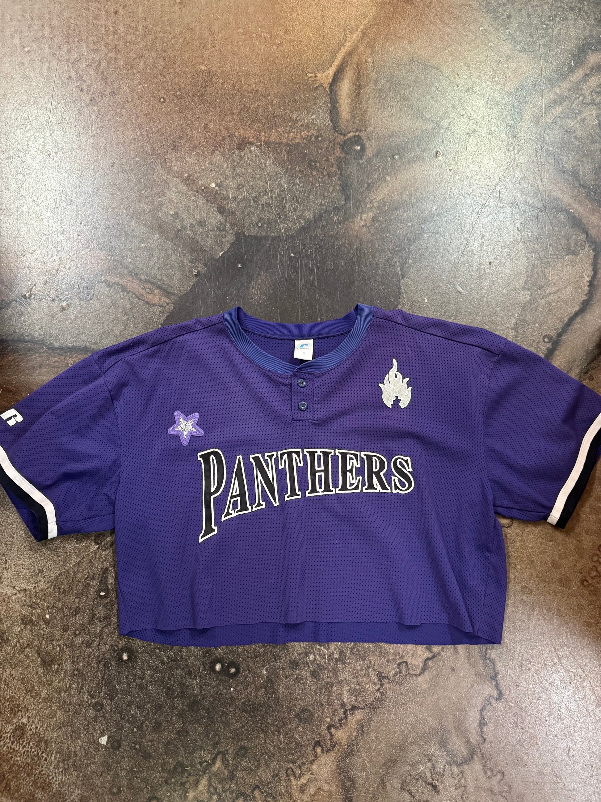 bring the spirit with sparkle in the bleacher babe x chesapeake panthers cropped jersey. this custom purple jersey is cropped for a playful fit and features bold purple-bordered glitter star patches and silver flame accents for a one-of-a-kind, game-day-ready look. perfect for pep rallies, practices, or showing off your panther pride with a little extra shine!