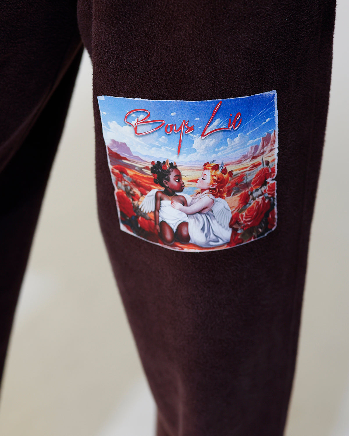 meet your new go-to cozy essential — the boys lie bffae alex sweatpants in rich chocolate brown. these fleece sweatpants feature a relaxed, slouchy fit with an elastic waistband for all-day comfort. a bold graphic patch on the leg brings that signature boys lie edge, making them equal parts comfy and cool. pair with the matching half-zip crew for the full set moment, or style solo with a baby tee and sneakers for that effortlessly laid-back vibe!