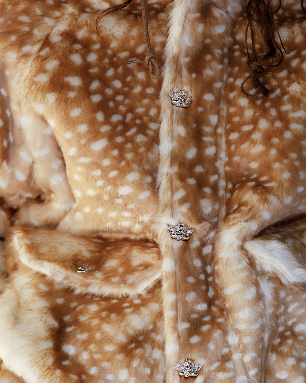snuggle up in style with the boys lie fawn over me manhunt jacket. this cozy faux-fur jacket features a delicate fawn print and a hood for extra warmth and effortless cool. gold cherub hardware on the zippers, buttons, and pockets adds a whimsical, luxe touch to the nature-inspired design — making it perfect for layering over tees, hoodies, or your favorite streetwear staples. flirty, playful, and effortlessly stylish — this jacket is ready to keep you cozy and on-trend all season long.