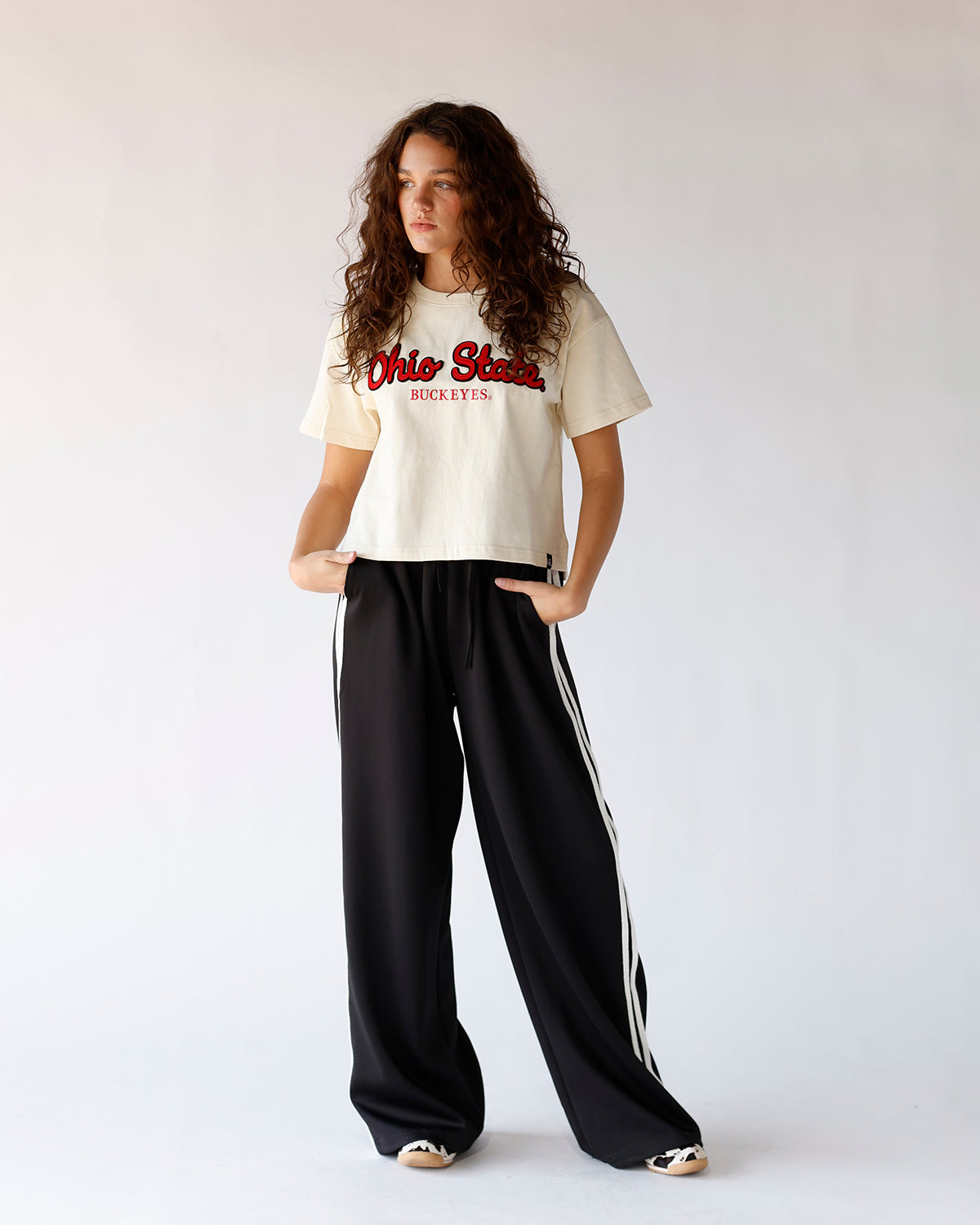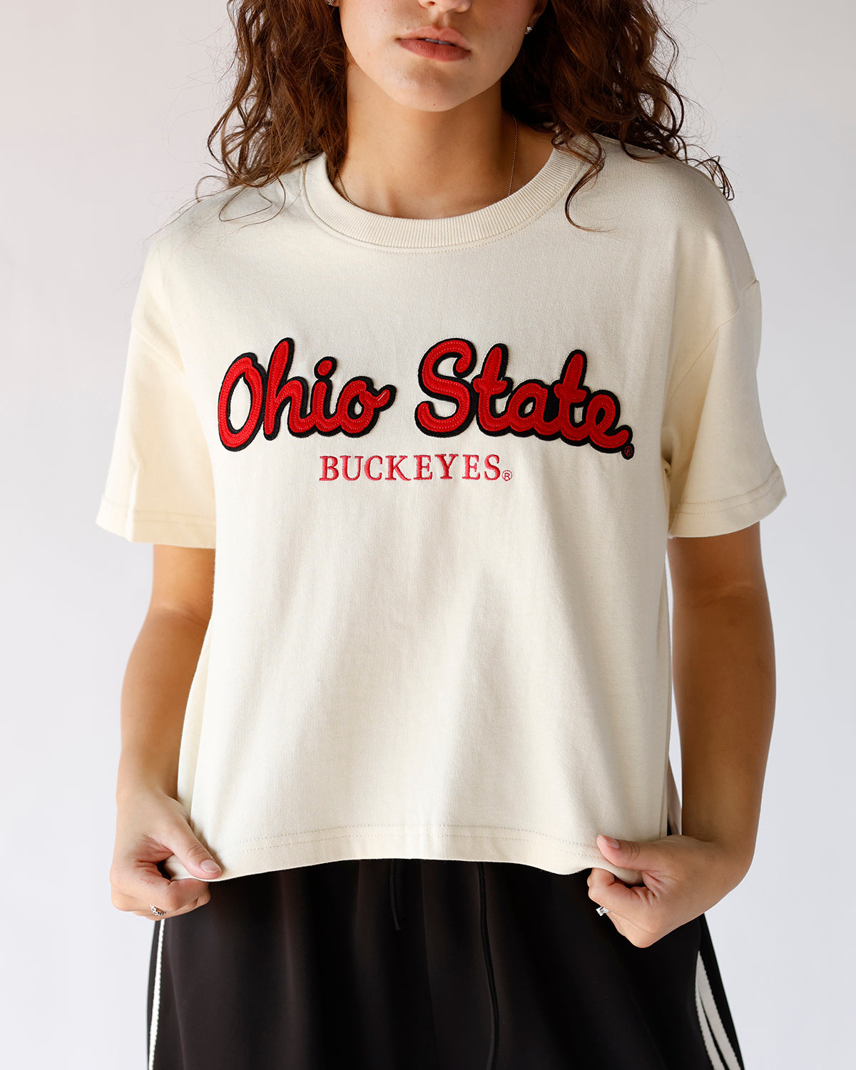 the buckeyes game day crop tee is the perfect mix of comfy and spirited, made for every buckeye babe who loves a roomy, oversized fit. the bold ohio state graphic pops against the classic oatmeal color, giving it that retro, college-girl vibe that’s perfect for game day or everyday wear. toss it on with biker shorts and sneakers for tailgates, pair it with distressed denim and a baseball cap for a casual campus look, or knot it up with a mini skirt and boots for a fun and flirty twist. whether you’re cheering in ohio stadium or grabbing coffee between classes, this crop tee is an effortless staple you’ll wear on repeat!! ❤️🤍