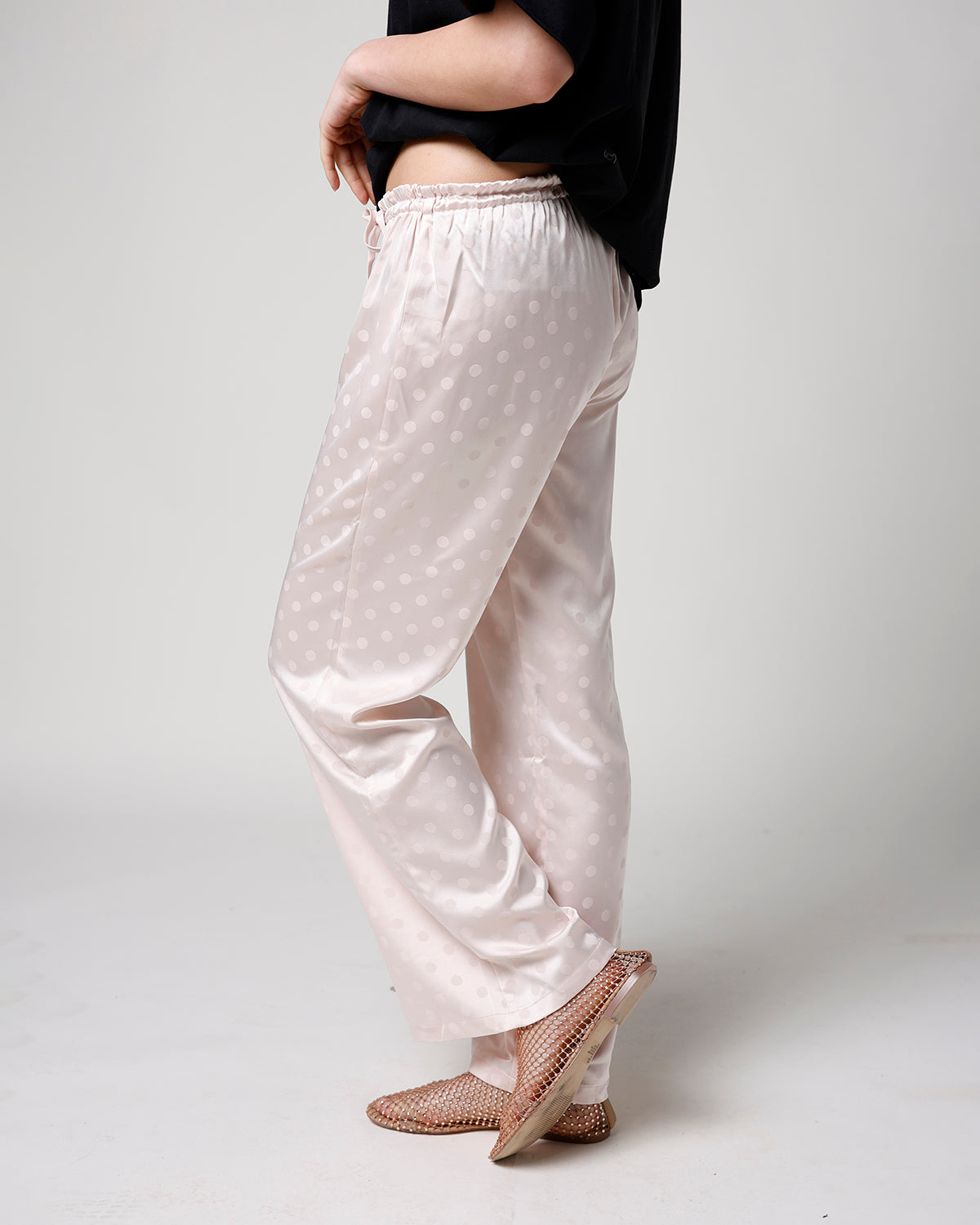 cute, comfy, and effortlessly playful 💕 the clara polka dot pants in pale pink feature a relaxed wide-leg silhouette with an elastic waistband and waist tie for the perfect adjustable fit. adorned with a sweet polka dot print and convenient side pockets, these pants are lightweight and breezy, making them perfect for everyday wear. pair them with a tucked-in tee, a cropped sweater, or a tank top for an effortlessly chic and playful outfit ✨
