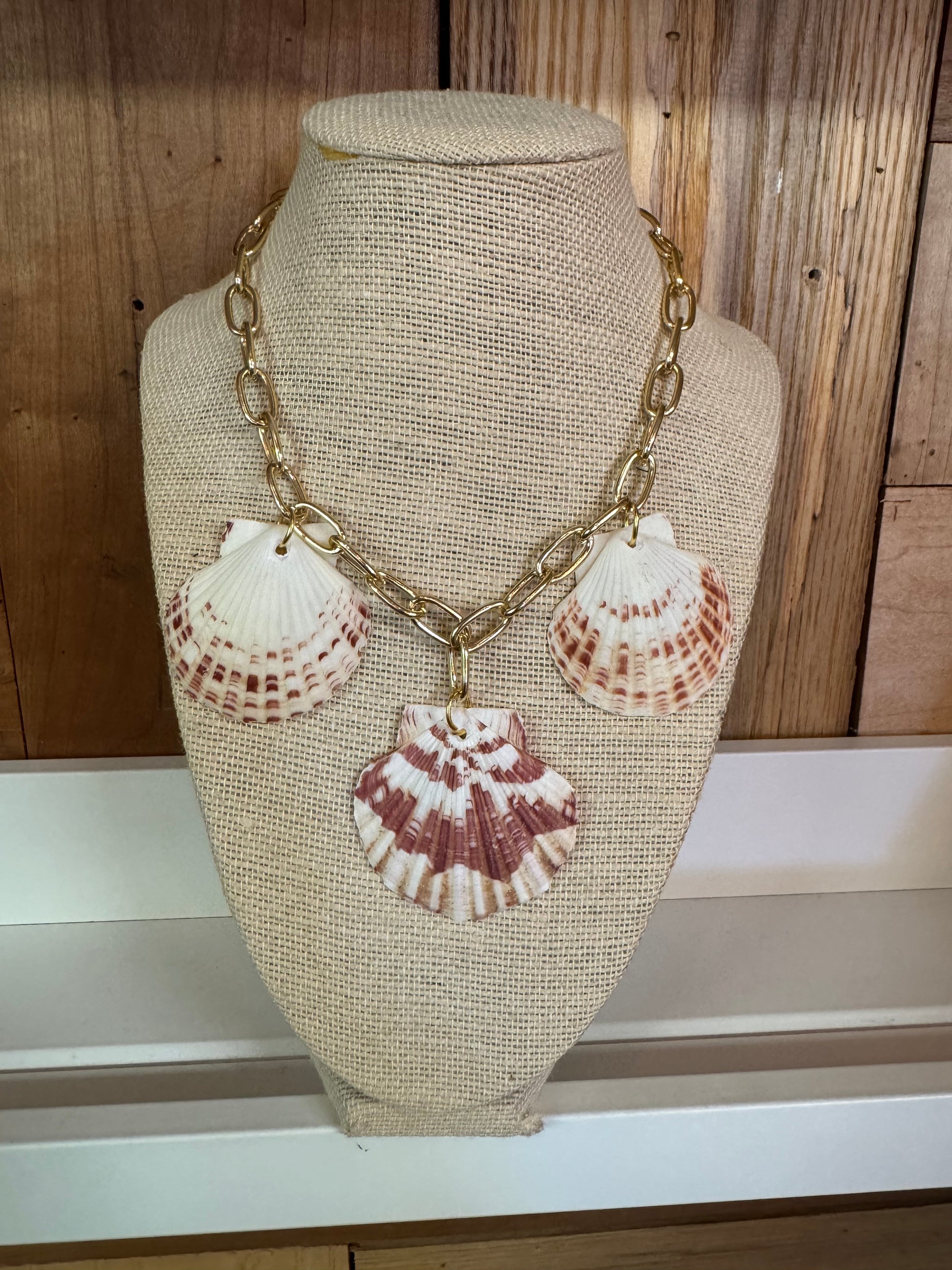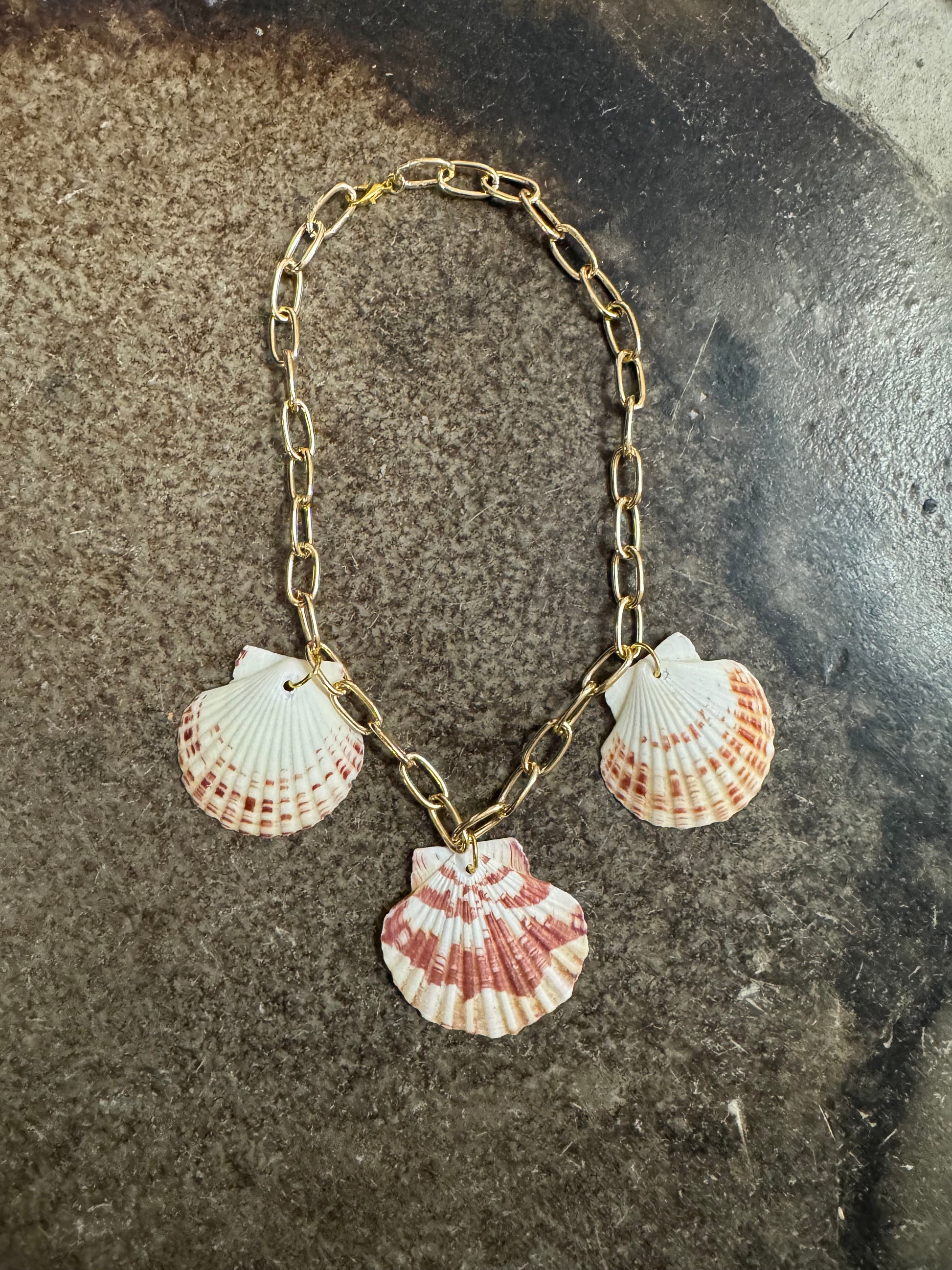 inspired by the beauty of the sea and the spirit of a wanderer, the coastal muse necklace features a radiant gold chain adorned with three bold seashell charms. this statement piece captures the essence of sunlit shores and salty air—perfect for daydreamers, beach lovers, and modern muses alike!