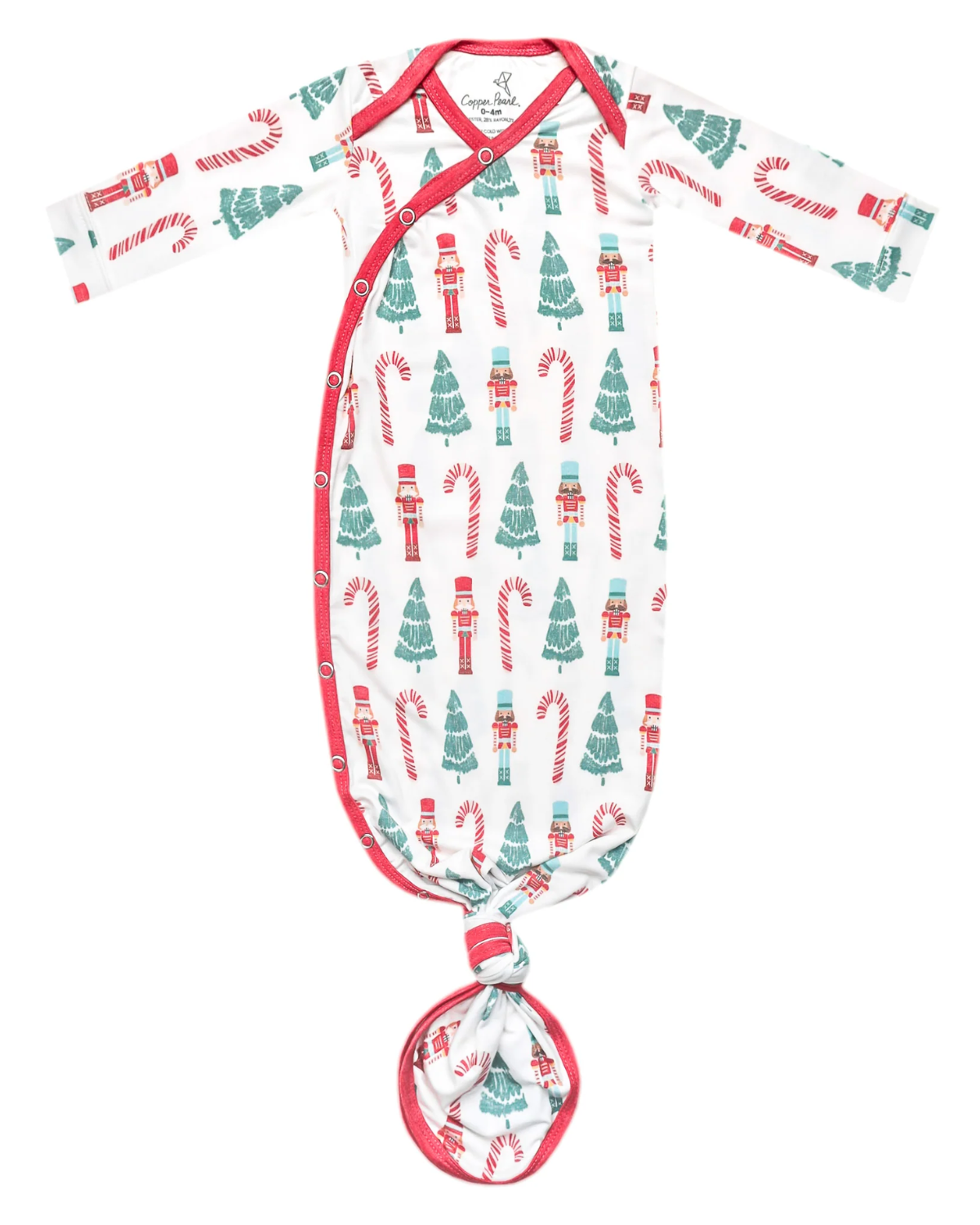 knot your average baby gown!! this premium polyester / rayon blend is so soft + stretchy for room to grow with a generous size of 25" in length and 8" in width! featuring unique straps to make dressing a breeze and fold-over hand mitts to prevent scratching. we love copper pearl for their high quality products that always look great on babies, moms, or in your nursery.