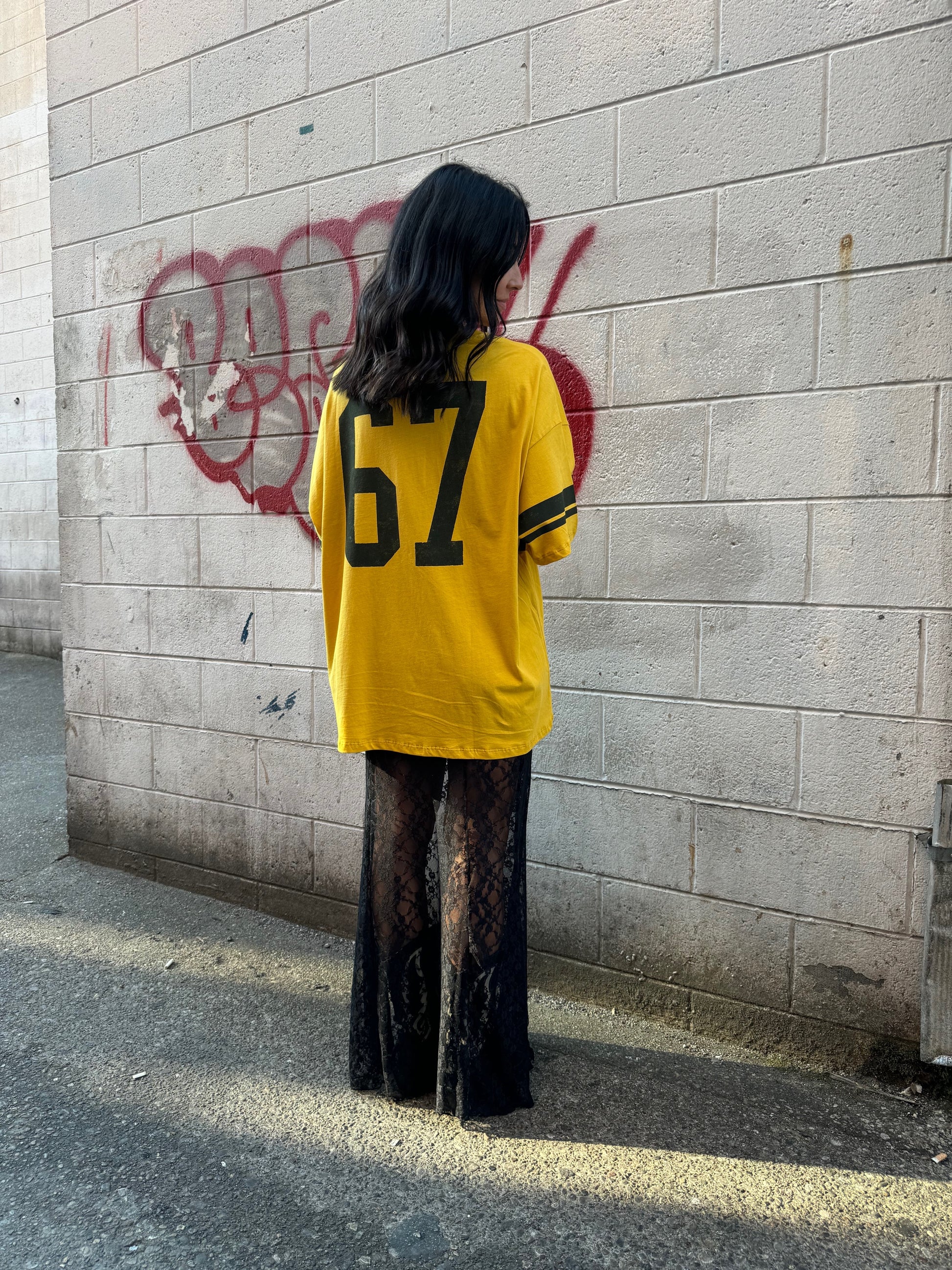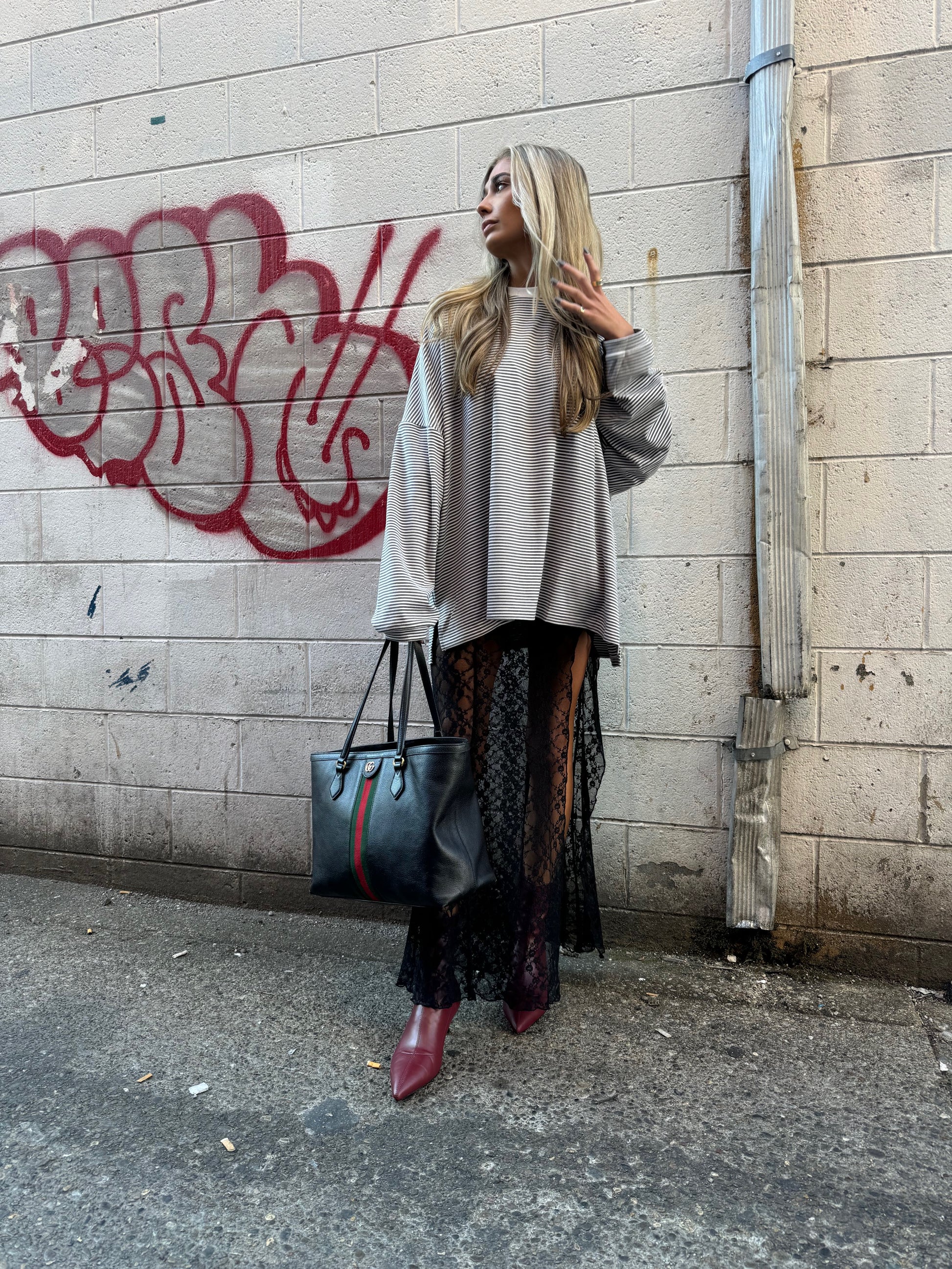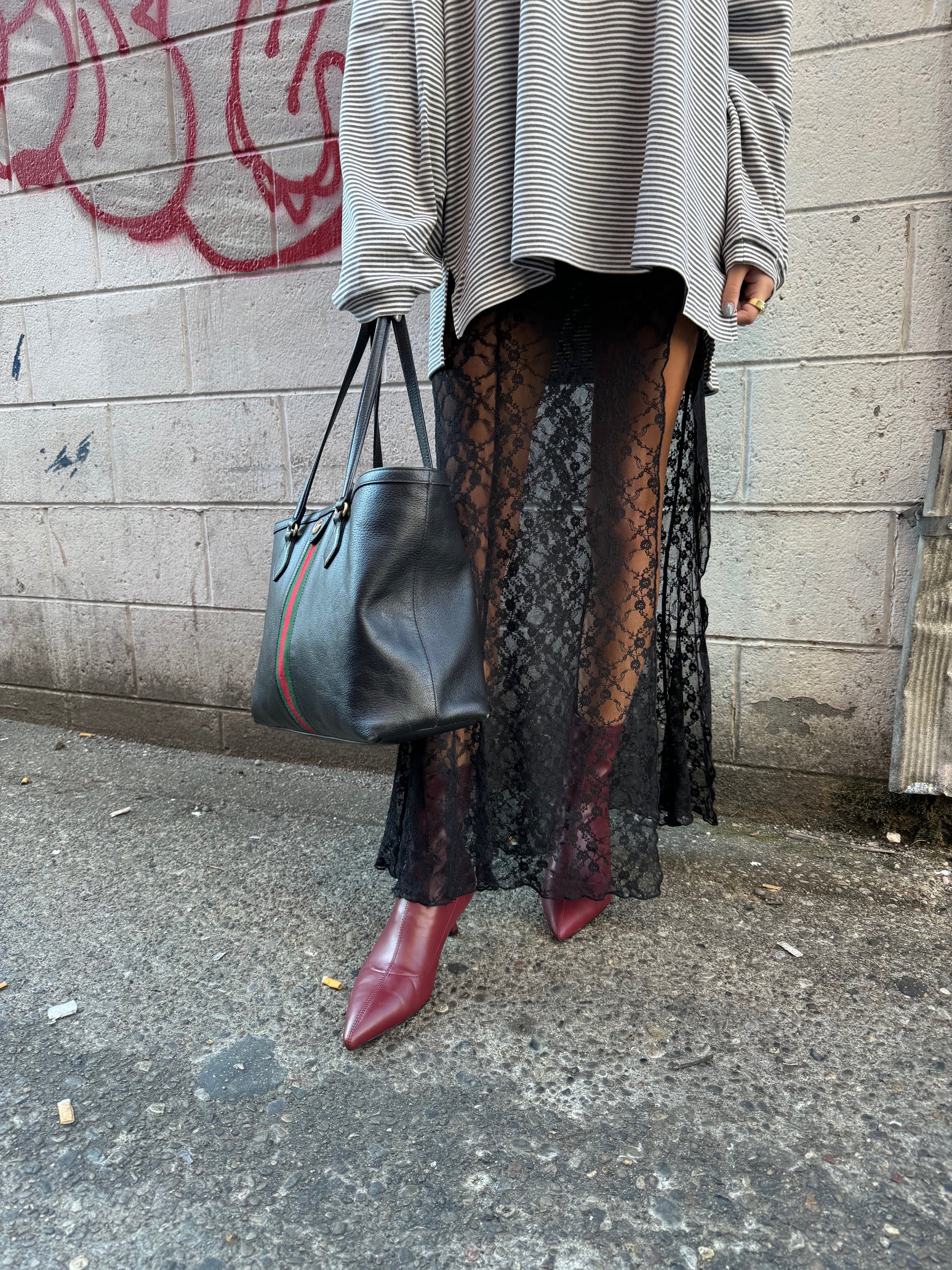 this sheer lace maxi skirt is a great way to elevate your oversized tops OR wear as festival bottoms! the elastic waist and side leg slit gives a comfy + flowy fit for all day wear!