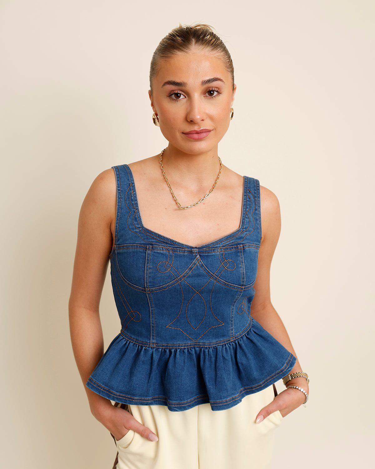 sweet, flirty, and effortlessly cool—the darling denim peplum top is your new favorite warm-weather essential. Made from soft, breathable denim, this sleeveless top features a fitted bodice that flares out at the waist with a playful peplum hem, creating a flattering silhouette that moves with you. whether you’re headed to a weekend brunch or a casual day out, this top pairs perfectly with high-waisted shorts, wide-leg trousers, or your favorite denim skirt. dress it up with wedges and layered jewelry or keep it casual with sneakers and a crossbody bag. the perfect balance of classic denim and feminine flair, this peplum top will quickly become a staple in your seasonal rotation!