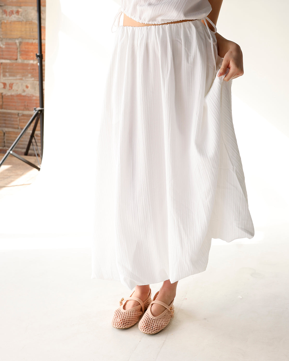 the deja vu bubble maxi skirt brings playful volume to a timeless silhouette. crafted in textured white fabric, this maxi skirt features a unique bubble shape that adds dimension and movement to every step. lightweight and versatile, it pairs beautifully with cropped tops, blouses, or tucked-in tees for brunches, garden parties, or casual chic days. for a cohesive, flirty look, style it with the matching deja vu tie top. effortlessly feminine and endlessly wearable, this skirt is a statement piece in any wardrobe.