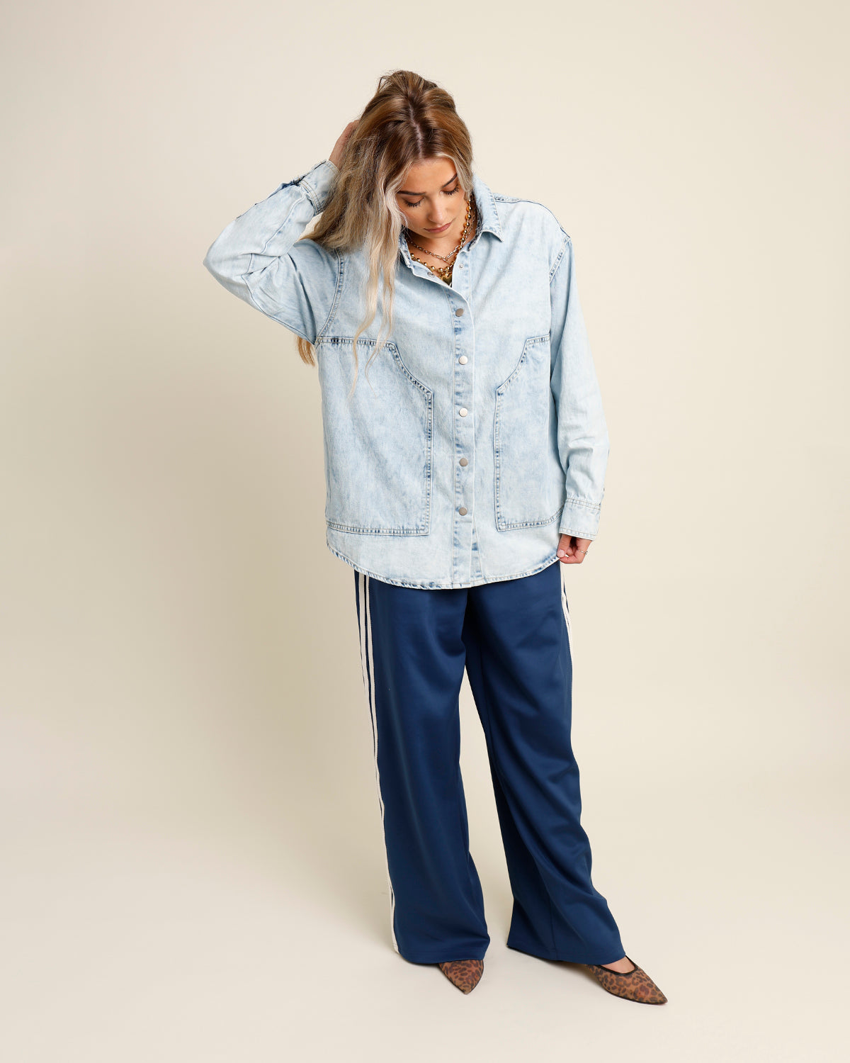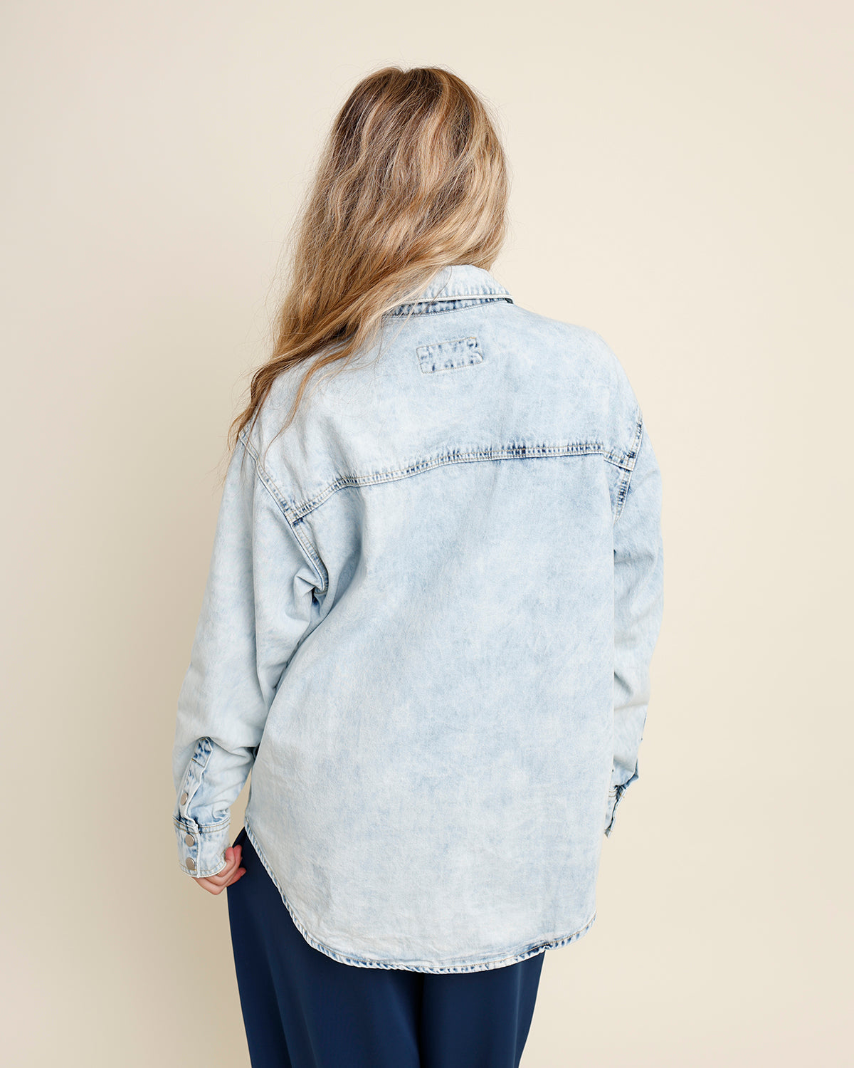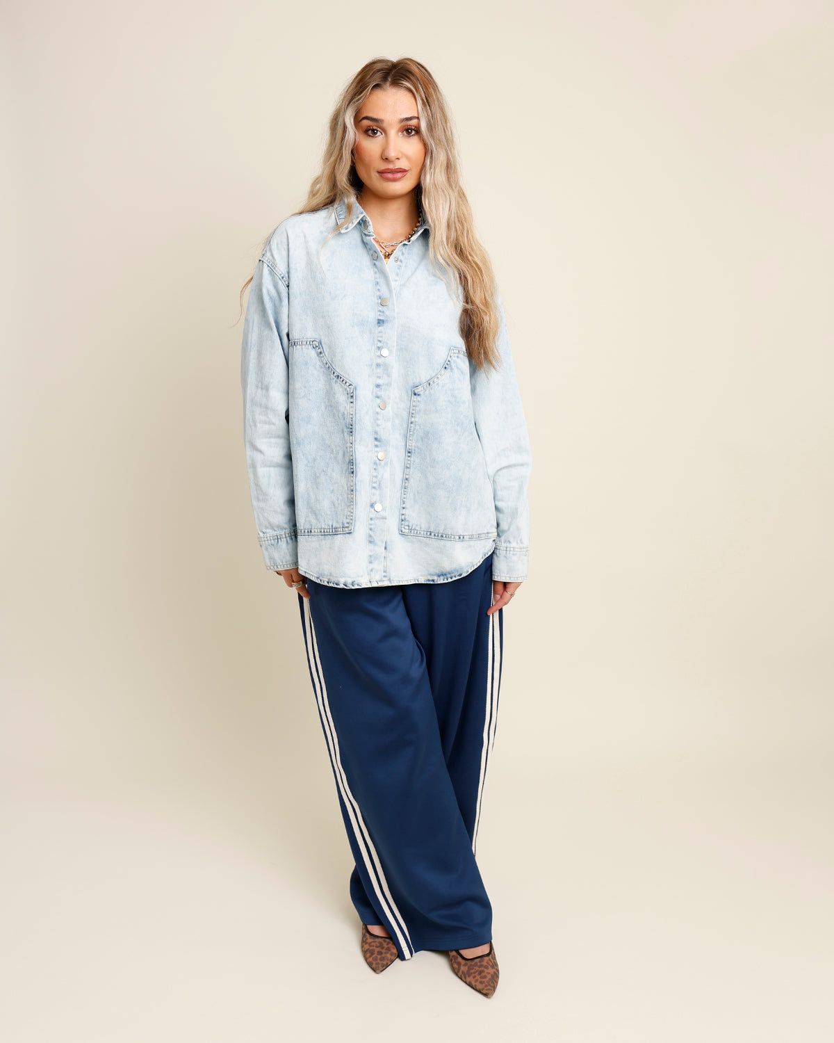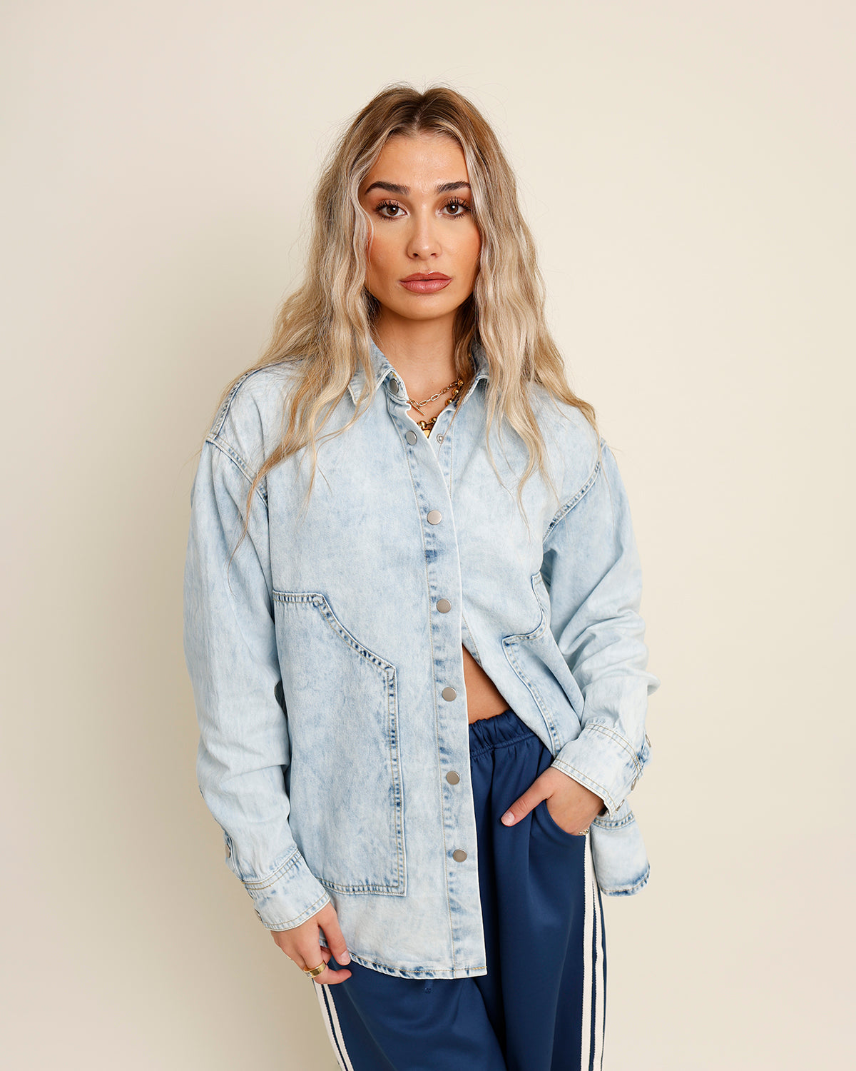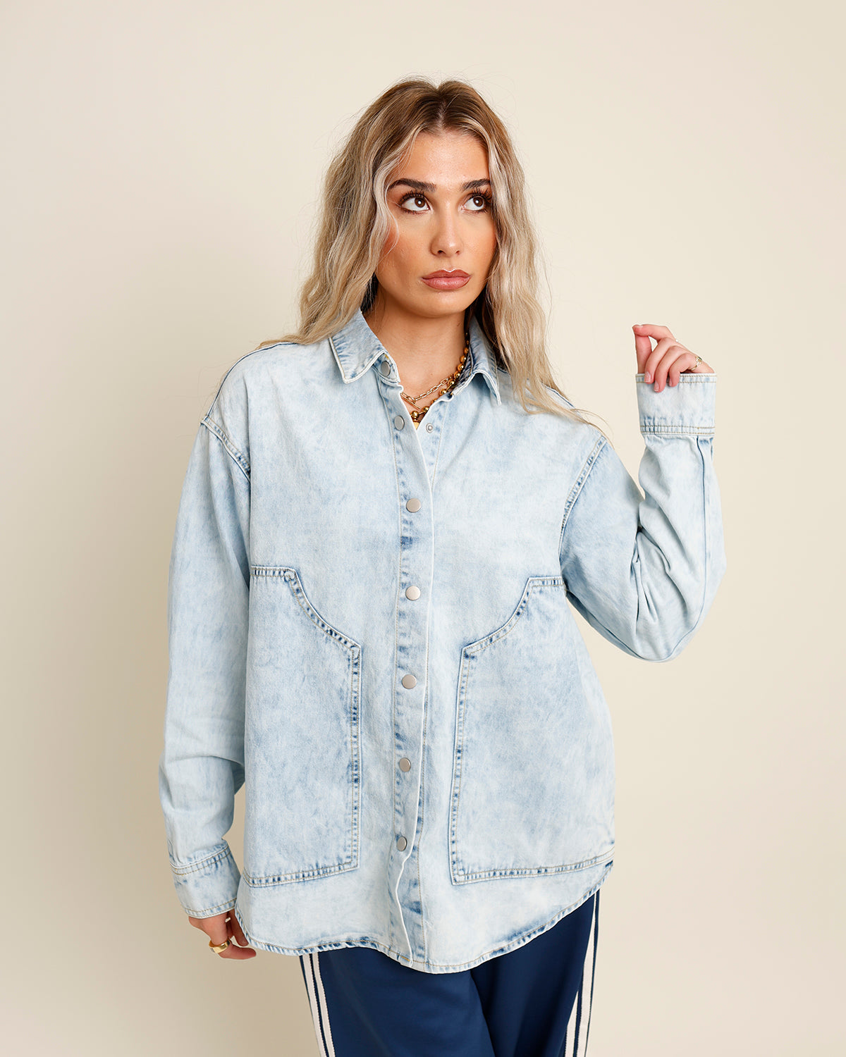 meet your new everyday favorite, the denim days button-up. this relaxed-fit shirt is all about carefree vibes and timeless denim charm. the washed finish gives it that effortlessly lived-in look (like it’s been your go-to forever), while the oversized patch pockets add a touch of casual-cool personality. snap buttons make it easy to wear open or closed, so you can style it as a top, a lightweight layer, or even a jacket on breezy days. pair it with your favorite cutoffs for a weekend outing, throw it over a sundress for that cool-girl contrast, or tuck it into jeans for a laidback denim-on-denim moment. however you wear it, this button-up is one of those magical pieces that feels both comfy and pulled-together at the same time. basically: effortless, easy, and endlessly cute — just like your style.