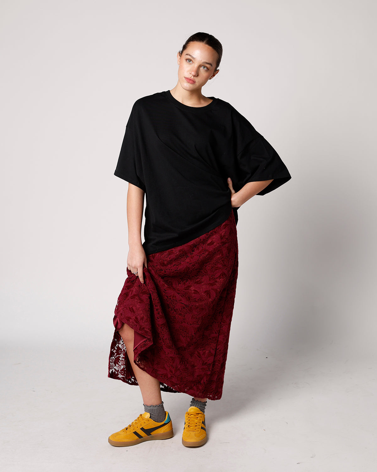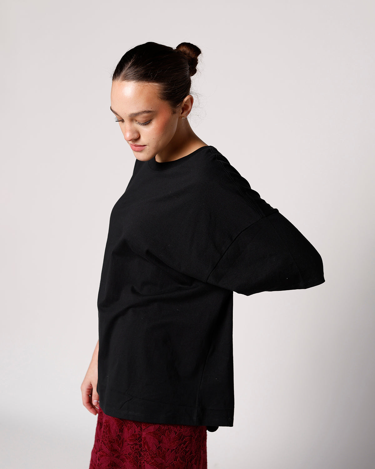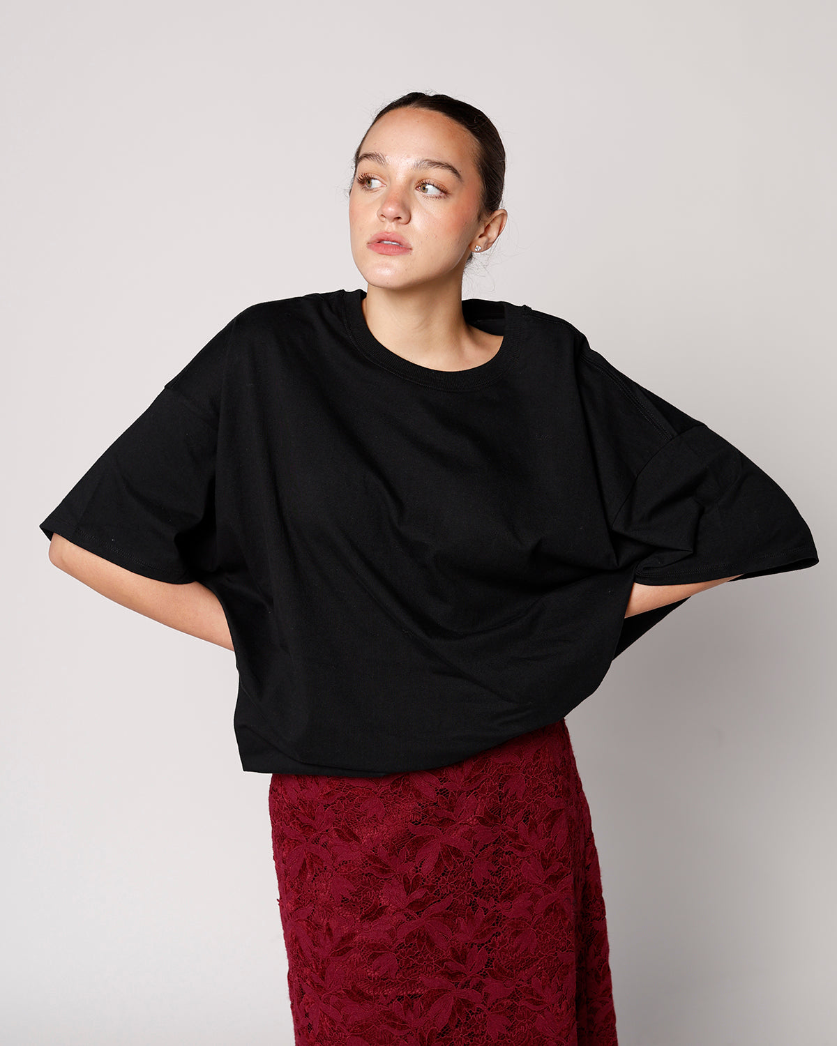 your new everyday go-to, the easy does it tee is all about effortless, laid-back style. this oversized short-sleeve tee features a relaxed fit, classic crew neckline, and drop shoulders for an easy, flattering silhouette. the sleek black hue makes it endlessly versatile — pair it with high-rise jeans and sneakers for casual daytime vibes, tuck it into a midi skirt for weekend brunch, or throw it on with leggings for a comfy, on-the-go outfit. soft, wearable, and effortlessly stylish, the easy does it tee is the kind of top you’ll reach for again and again.