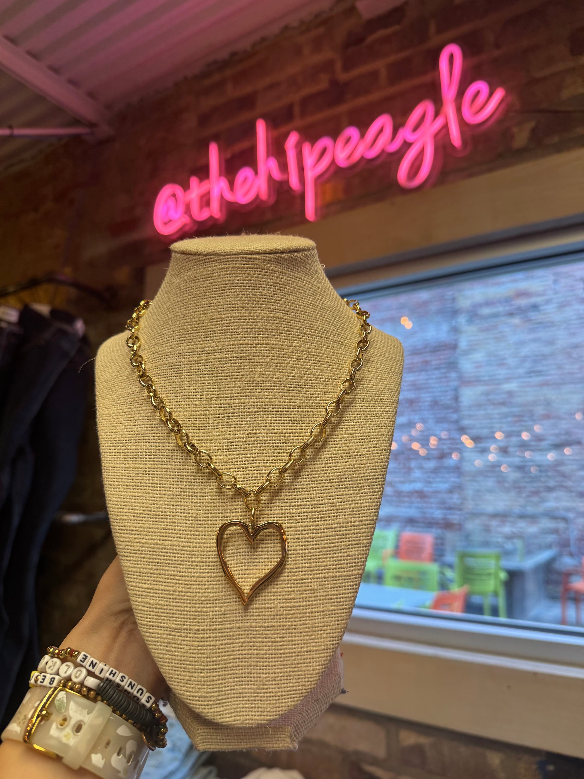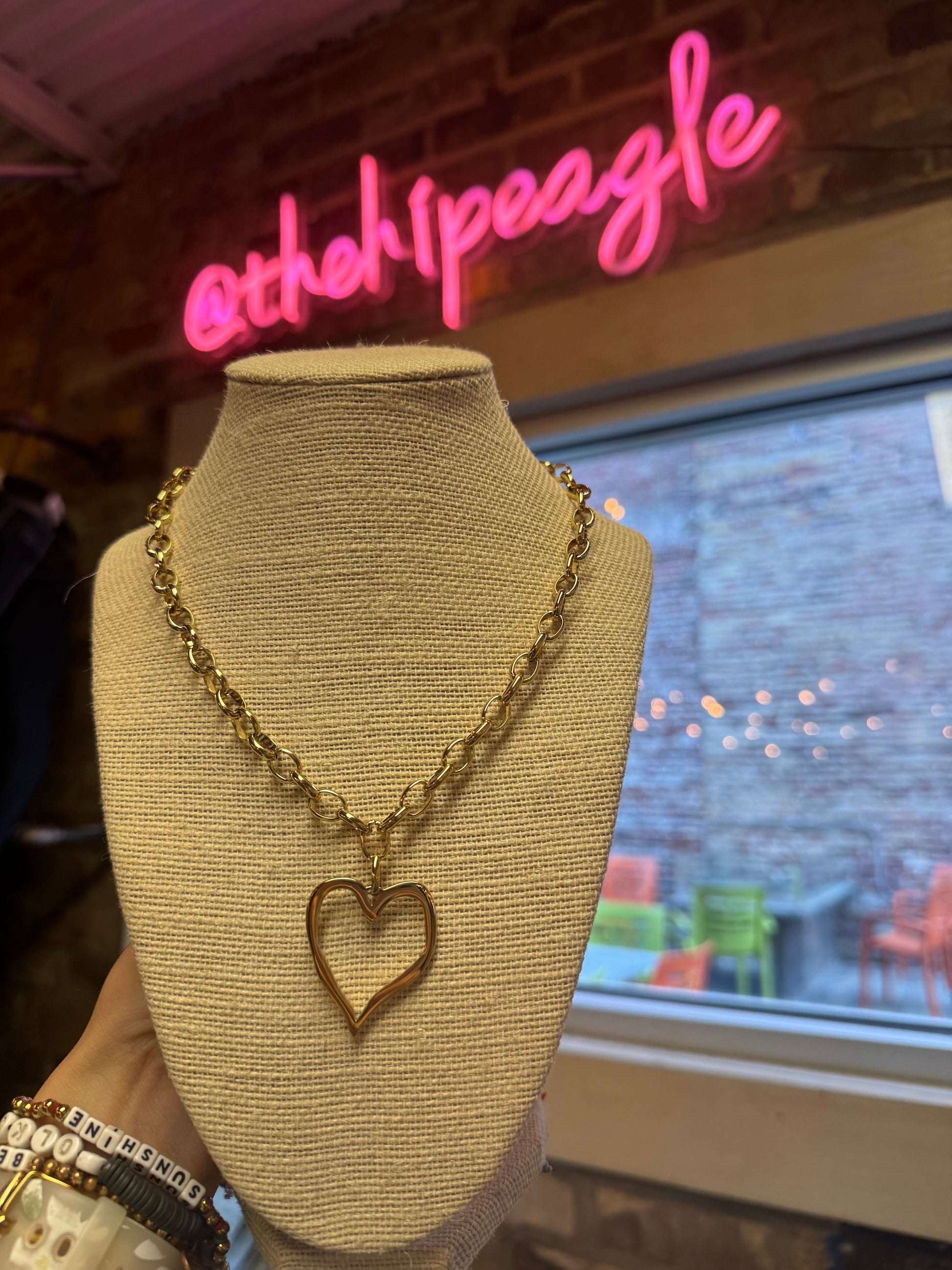 a little love that makes a statement! this chain necklace with an open heart charm and 16-inch chain with 2-inch extender is perfect for wearing solo or layering with your favorite delicate chains. try it over a cozy oversized sweater with jeans for a sweet, everyday look, or mix it with shorter and longer necklaces for a fun layered vibe. it pairs beautifully with flowy dresses, cute blouses, or even a simple tee and cardigan—love you can wear, wherever you go!