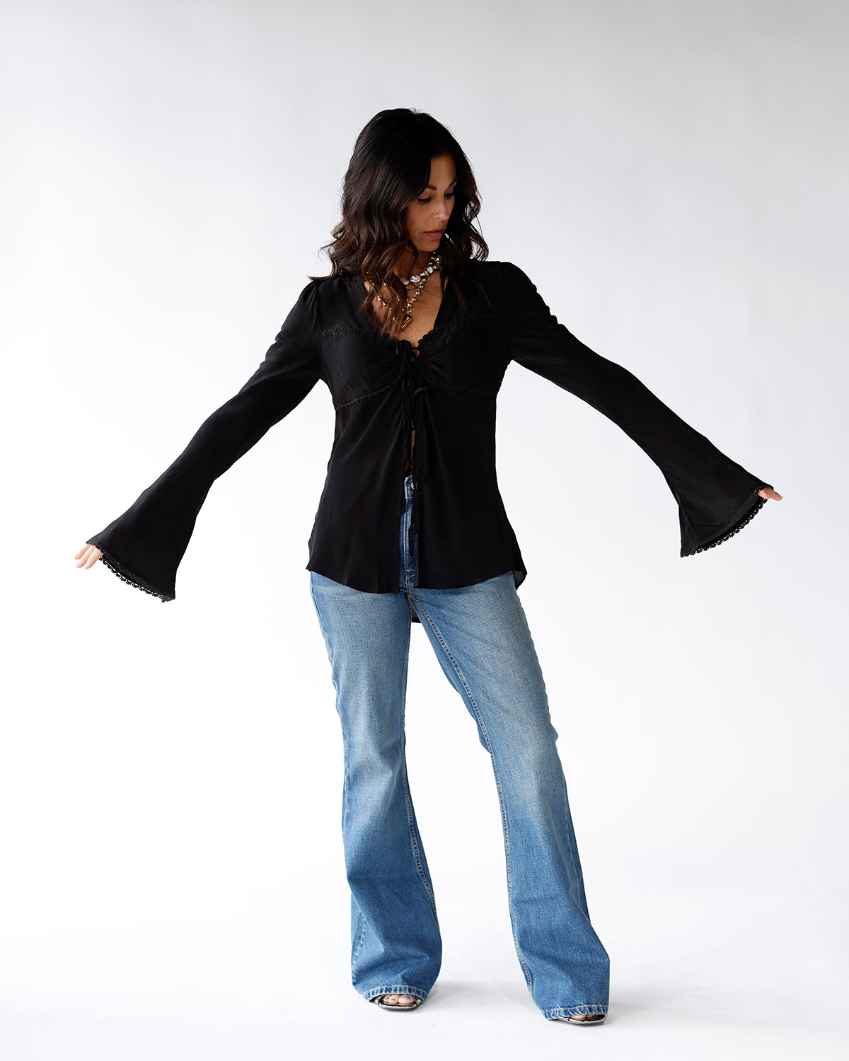 meet the bali ariel top in black — effortless, flirty, and full of charm. this flowy top features graceful bell sleeves, a relaxed silhouette, and delicate embroidered scallop trim along the bust and cuffs. the v-neckline and tie-front closure add a playful, feminine touch, while the satiny fabric feels soft and luxurious against the skin. pair it with high-waisted jeans for a casual-chic look, or tuck it into a skirt with heels for an easy date-night outfit. versatile, flattering, and totally on-trend, this top is ready for all your style moments.