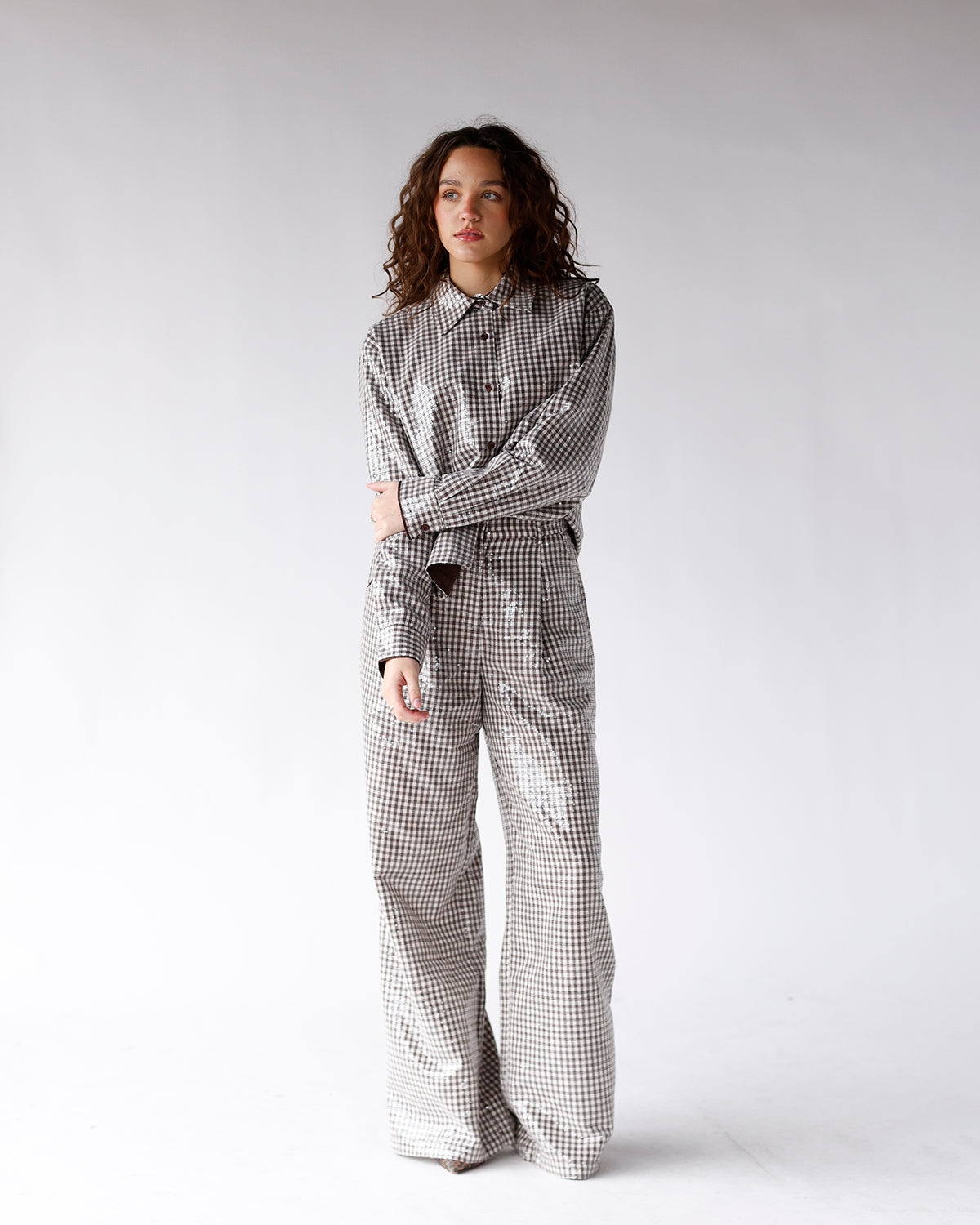 the frnch baloo chocolate shirt is a playful, sparkling twist on a classic gingham top. featuring a crisp collar, long sleeves, and subtle sequins woven throughout, this shirt adds a little shine to everyday outfits. pair it with the matching frnch ninou chocolate pants for a coordinated, head-to-toe look, or style it with dark denim or a simple skirt for a chic, versatile vibe. perfect for brunch dates, holiday gatherings, or anytime you want to add a touch of fun and sparkle to your wardrobe.