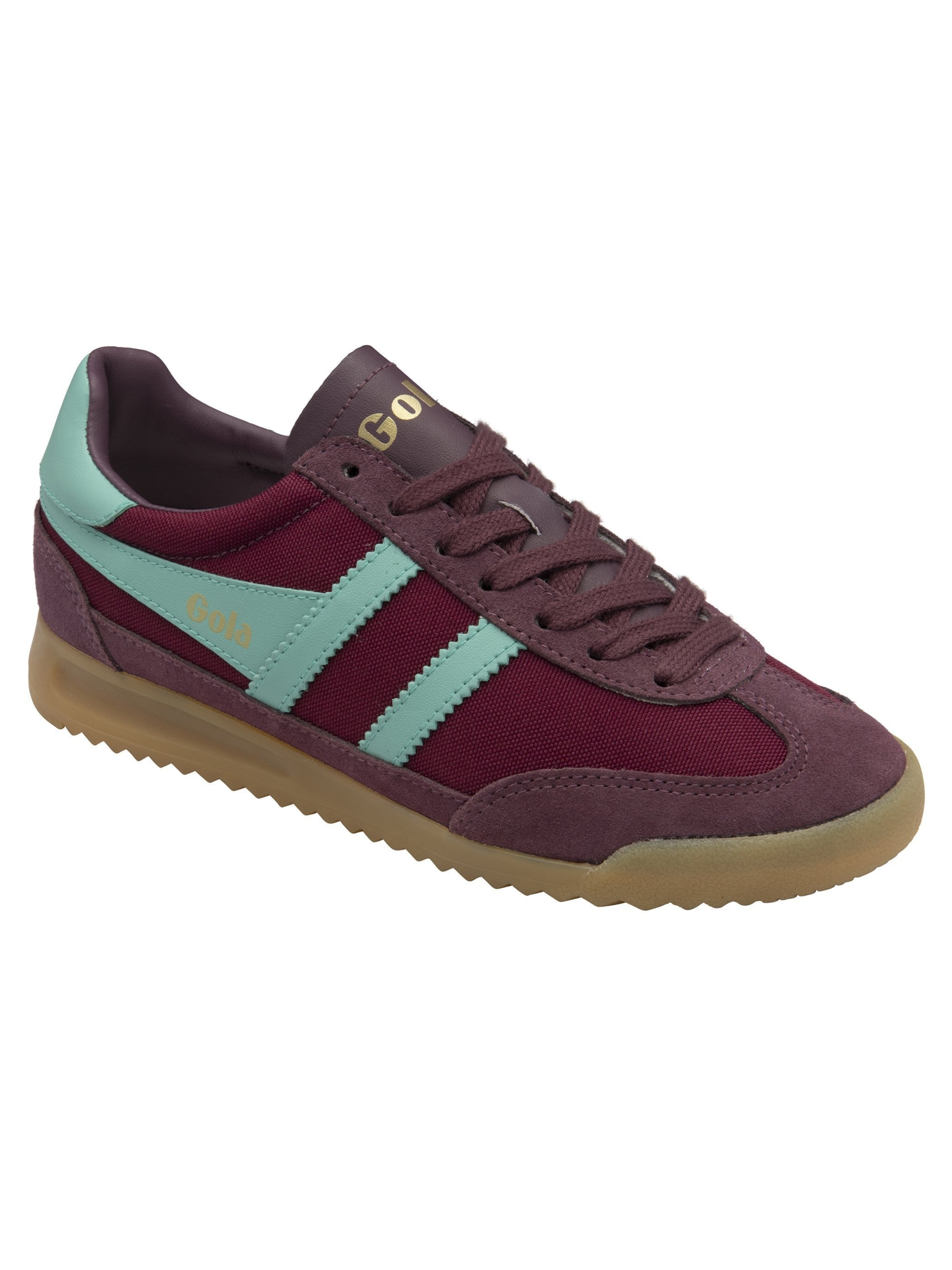 the gola classics women’s tornado sneakers in windsor wine/sea mist bring retro terrace style back in a bold, everyday silhouette. designed with a heavy weave nylon upper in rich windsor wine, these sneakers are accented with tonal suede trims at the toe, heel, and lace facing for added texture and depth. a contrasting sea mist gola wingflash side trim with signature sawtooth edges delivers that unmistakable heritage look. finished with a slight wedge gum sole, tornado offers the full old-school sneaker package — sporty, timeless, and effortlessly cool. perfect with denim, trousers, or casual dresses for an elevated off-duty vibe.