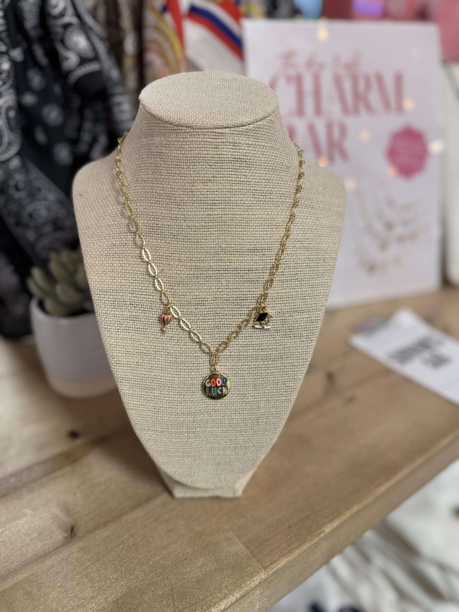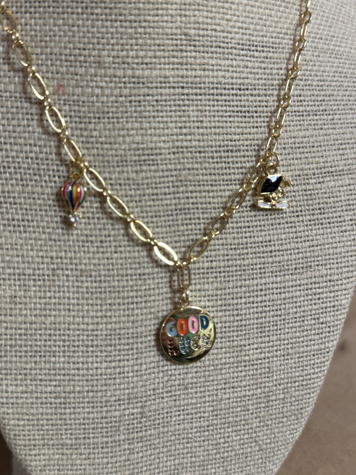 say, "good luck, grad!" GOOD LUCK, GRAD! CHARM NECKLACE! this gold-filled necklace features a grad cap and diploma charm, a hot air balloon charm, and a good luck charm. this makes THE perfect graduation gift!