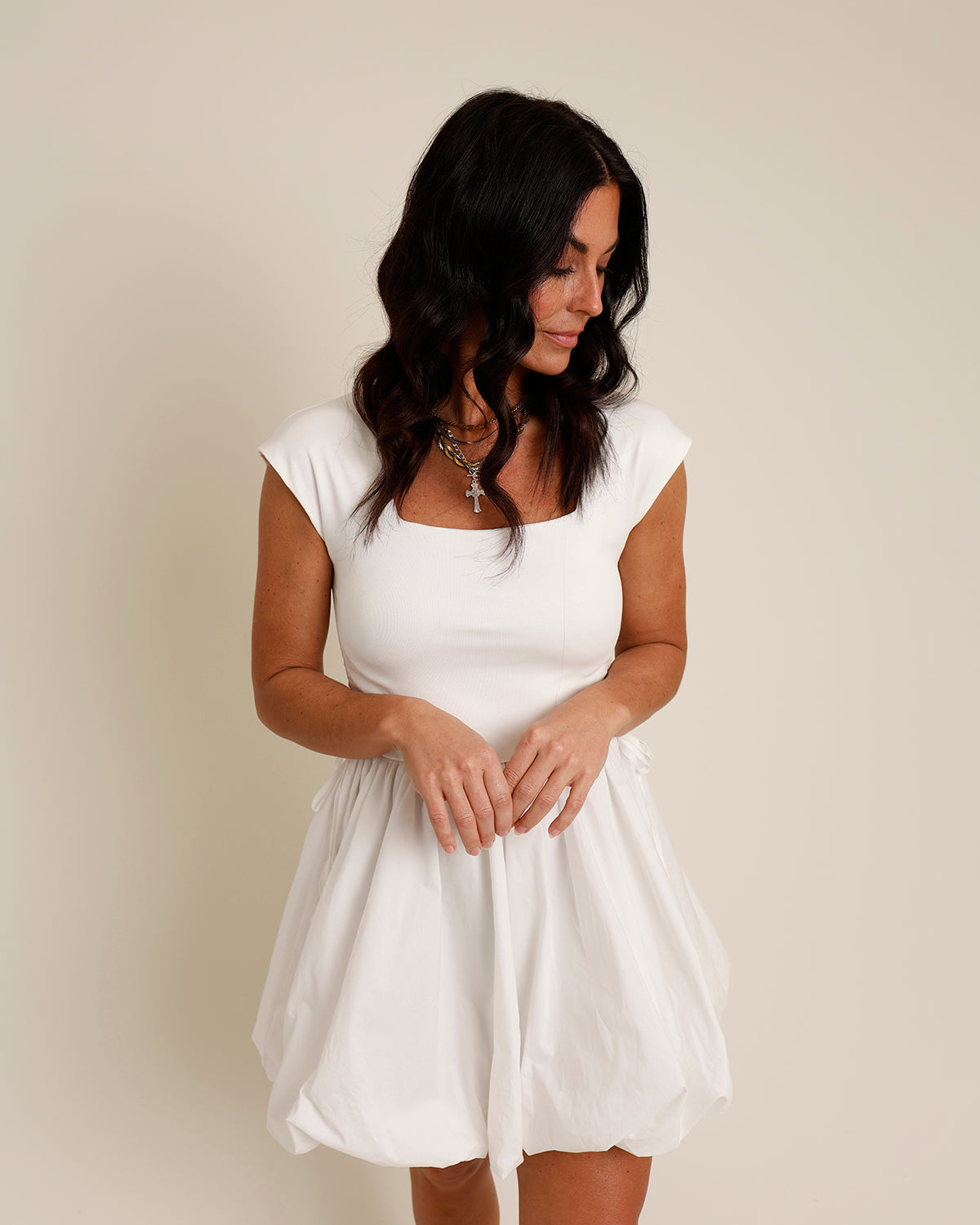 float through any occasion with our head in the clouds bubble hem mini dress! featuring a fun and flirty bubble hem and adjustable side cinch, this dress is sure to make a statement. perfect for graduations, easter gatherings, or vacation getaways, this white dress gives you the freedom to have a little fun while looking stylish!