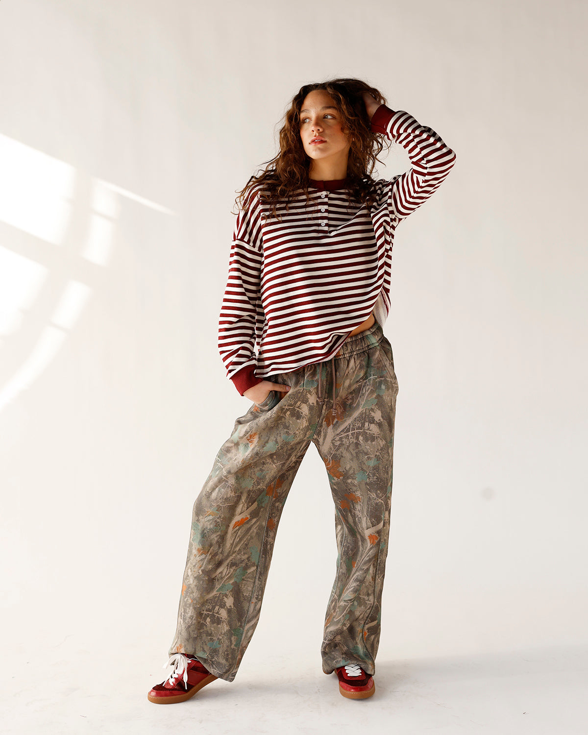the hip all day striped henley long sleeve top is your new everyday essential with an easy, effortless twist. part of the hip eagle, our signature brand designed to deliver easy, everyday staples with a little extra style, this long sleeve features a classic henley neckline and timeless wine-and-white stripes. soft, cozy, and endlessly versatile, it’s perfect for layering under jackets or wearing on its own. style it with your favorite denim and sneakers for casual days, pair it with barrel sweats for laid-back off-duty vibes, or dress it up with tailored pants and boots for a polished everyday look. made to be worn on repeat, the hip all day striped henley long sleeve top is the kind of staple you’ll reach for again and again.
