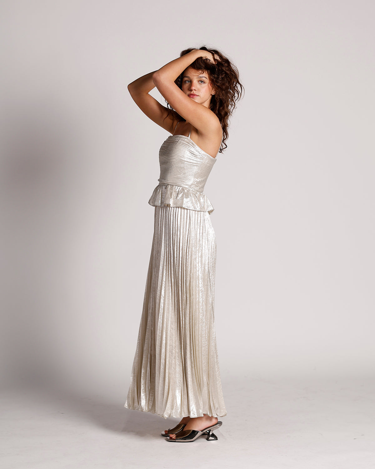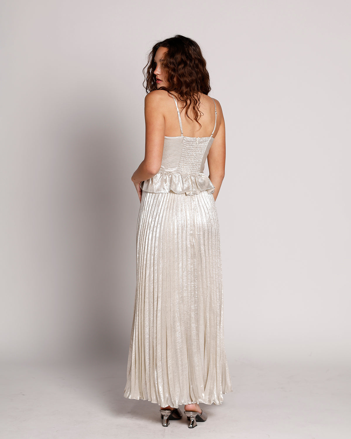 step into the spotlight with the lunar glow peplum pleated maxi dress. this silver, shimmering gown features a flattering peplum waist and a fully pleated maxi skirt that flows with every step. delicate spaghetti straps and a strapless-inspired bodice add a touch of elegance, making it perfect for weddings, holiday parties, or any occasion where you want to feel radiant and effortlessly chic. pair with metallic heels and sparkling jewelry for a head-to-toe luminous look.