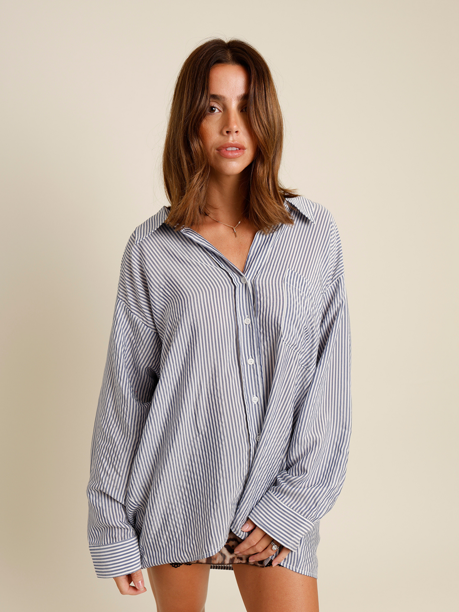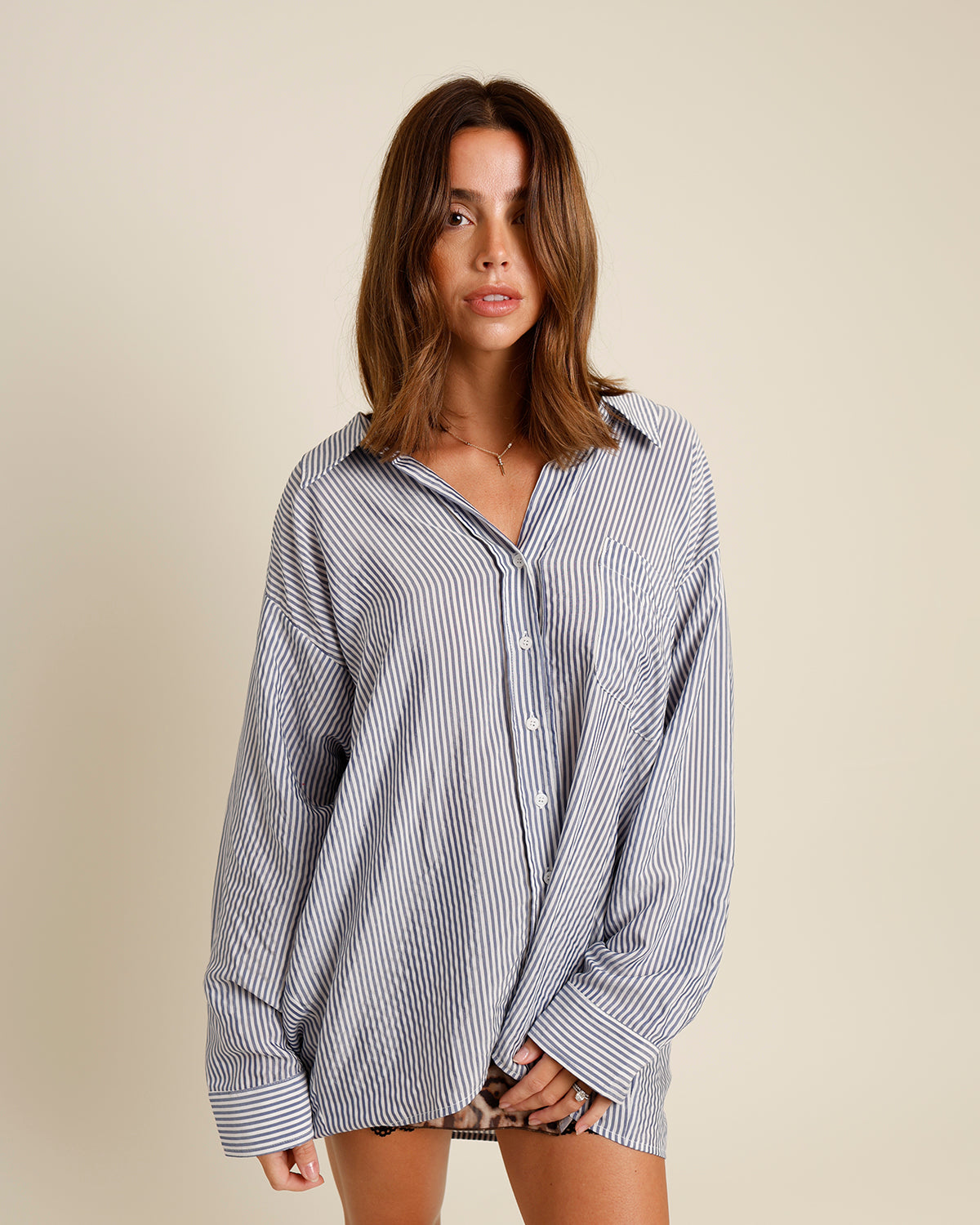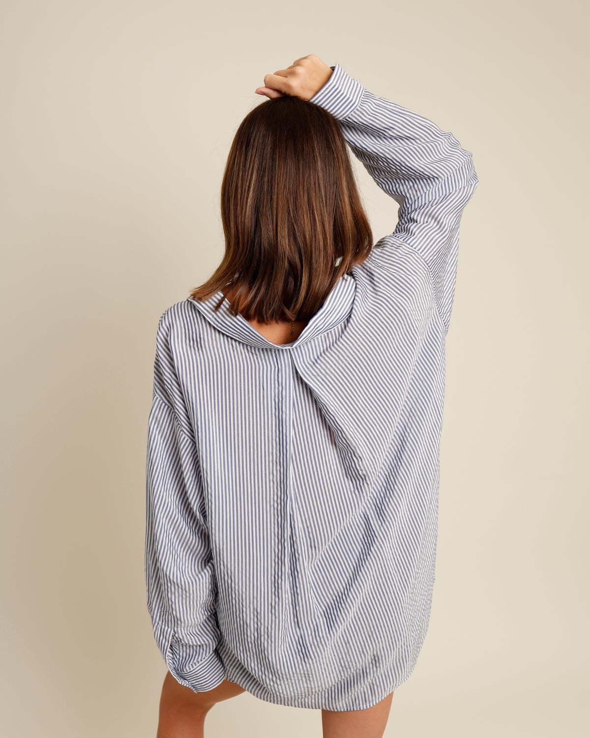 a laid-back take on a classic, this blue and white striped button-up is all about easy style with just a little something extra. the relaxed fit and drop shoulders make it feel like your favorite oversized tee, while the subtle back pleat adds flow and movement (fancy, right?). plus, there’s a handy breast pocket for your essentials or just looking cool. whether you’re layering it over jeans or tucking it into your go-to skirt, this top is effortless, breezy, and ready to keep up with whatever your day throws at you.