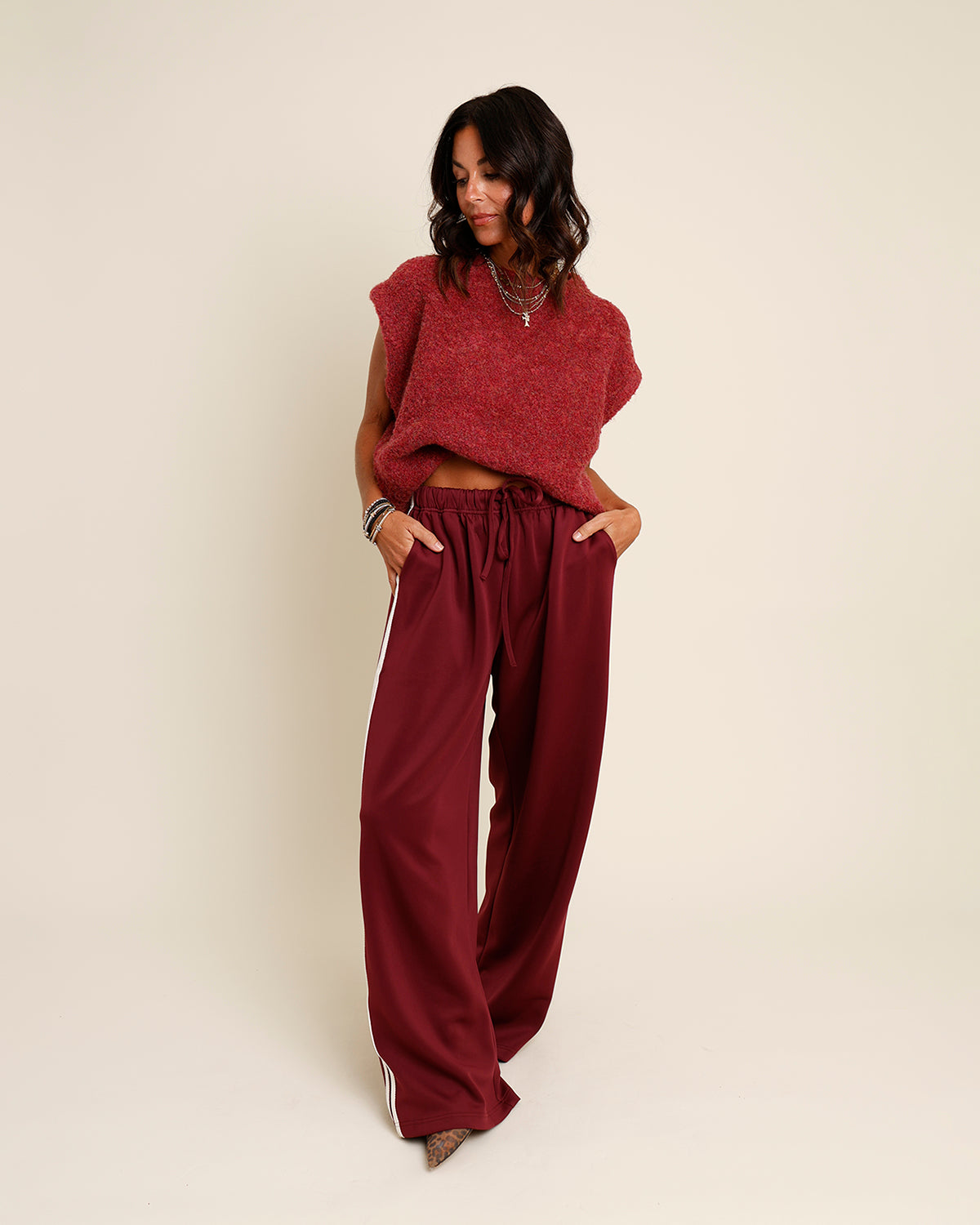 a total vibe!! these wide-leg track pants bring sporty throwback energy with a modern, satiny twist ✨ smooth, flowing fabric meets relaxed fit and bold side stripes for all-day comfort and style. the elastic waistband with adjustable drawstring means you’re always ready to flex your move. pair with a fun graphic tee, cropped tank, or oversized sweatshirt for an easy, cool look that’s all about good vibes and effortless style!