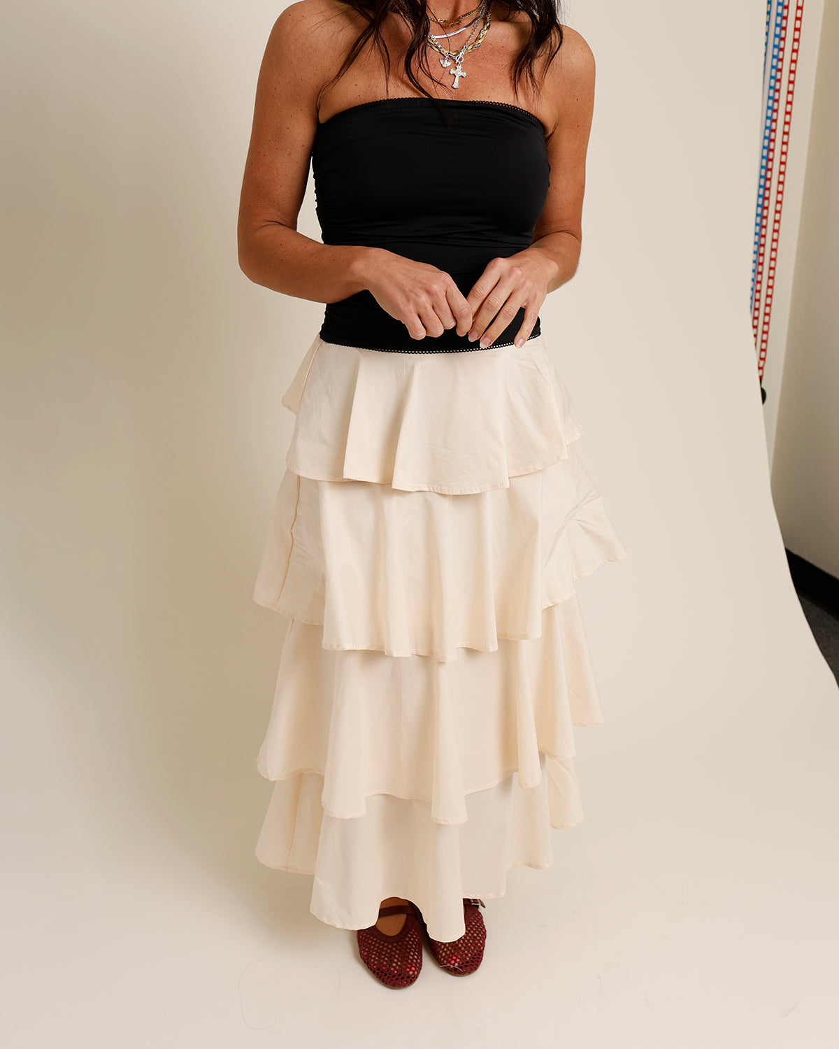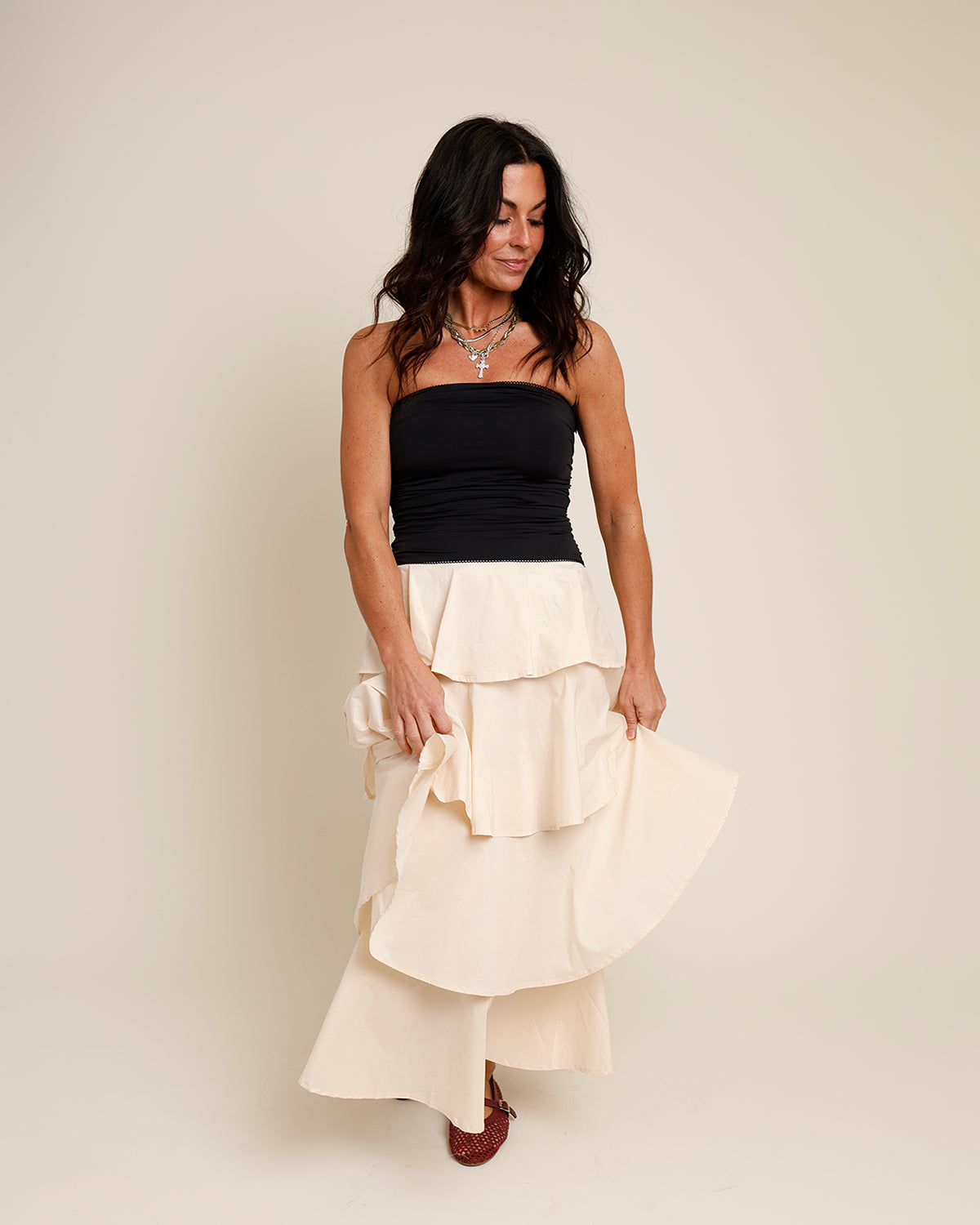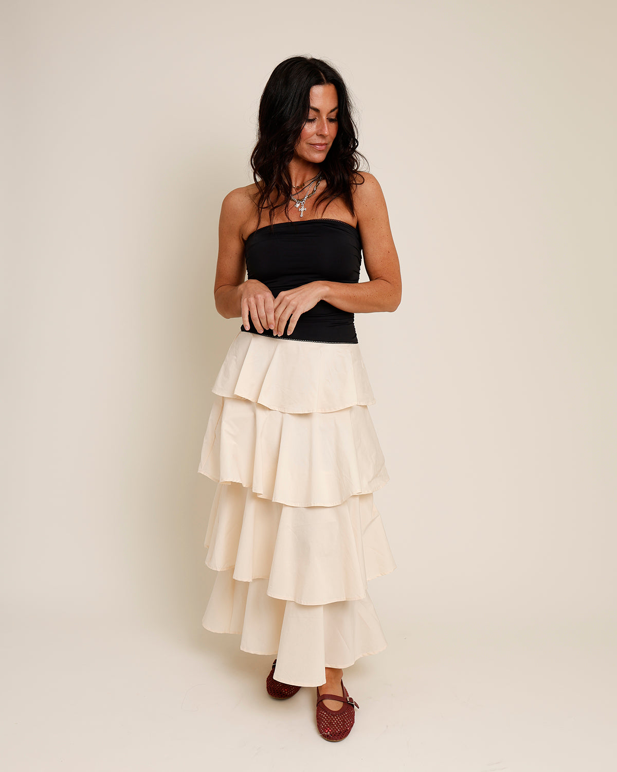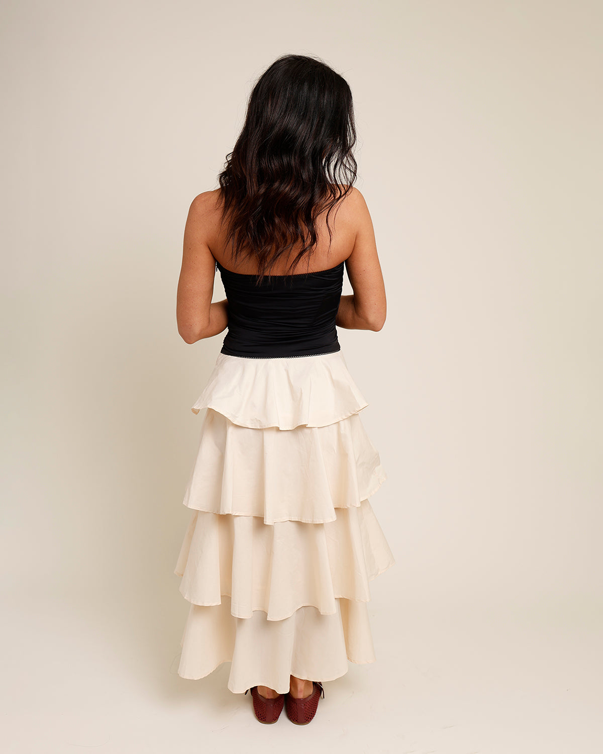 a dreamy mix of structure and flow. the mathilda dress features a ruched knit bodice that hugs just right, paired with a voluminous tiered poplin skirt for the perfect contrast. feminine, effortless, and made to move!