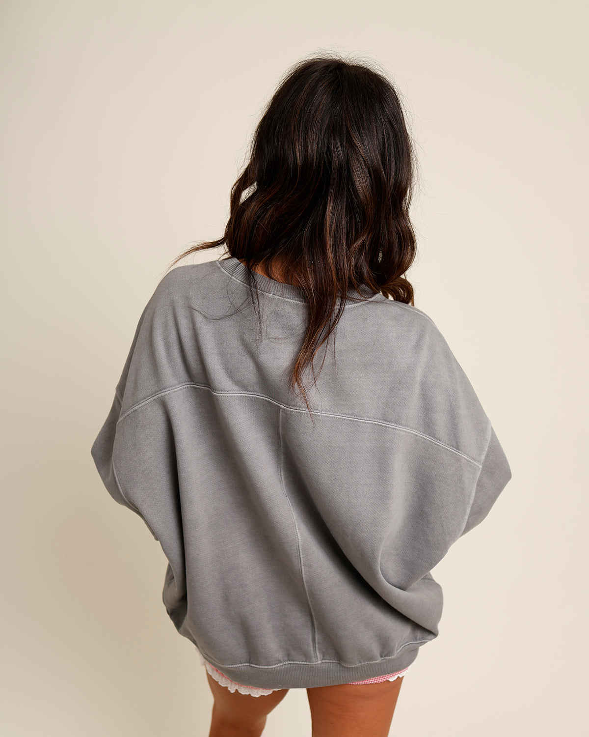 introducing notte crew, the oversized vintage-wash sweatshirt that elevates casual style. with a relaxed silhouette, cozy ribbed trim, and washed finish, this sweatshirt is perfect for effortless cool. the charcoal color adds a touch of vintage charm. stay comfortably stylish with notte crew.