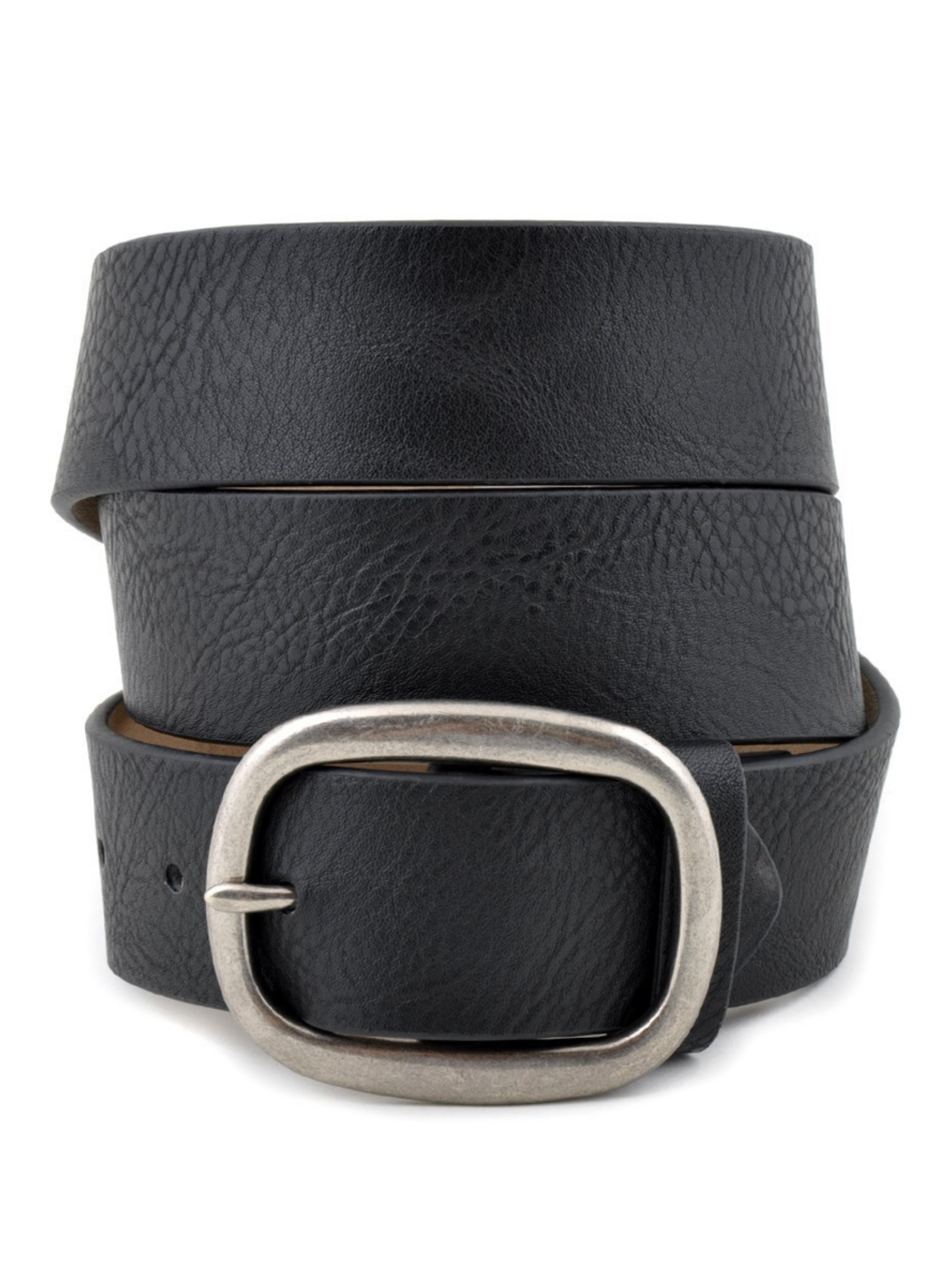 add a unique touch to your outfit with this oval buckle belt. made with vegan leatherette, this belt features a trendy oval-shaped buckle in a antique finish in a width of 1.5", perfect for everyday wear. available in sizes small, medium, and large with a strap length of up to 39", it's the perfect accessory for any outfit.