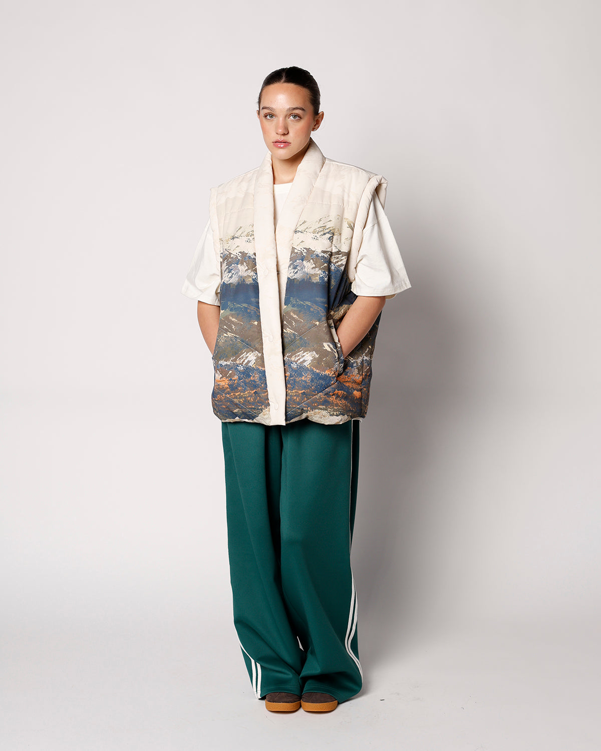 the peak dreams puffer vest is your ultimate statement layering piece, bringing bold, scenic charm to cozy-chic style. featuring a stunning mountain landscape print with soft beige trim details, this vest blends playful, adventurous energy with everyday wearability. lightweight yet warm, it layers perfectly over chunky sweaters, hoodies, or long-sleeve tees, while the neutral beige accents pair effortlessly with jeans, leggings, wide-leg pants, or even midi skirts for versatile styling. designed with a slightly oversized fit for comfort and ease of movement, it’s perfect for weekend hikes, crisp autumn mornings, or casual city strolls. the peak dreams puffer vest adds warmth, drama, and scenic-inspired style to every outfit—your bold, cozy wardrobe essential.