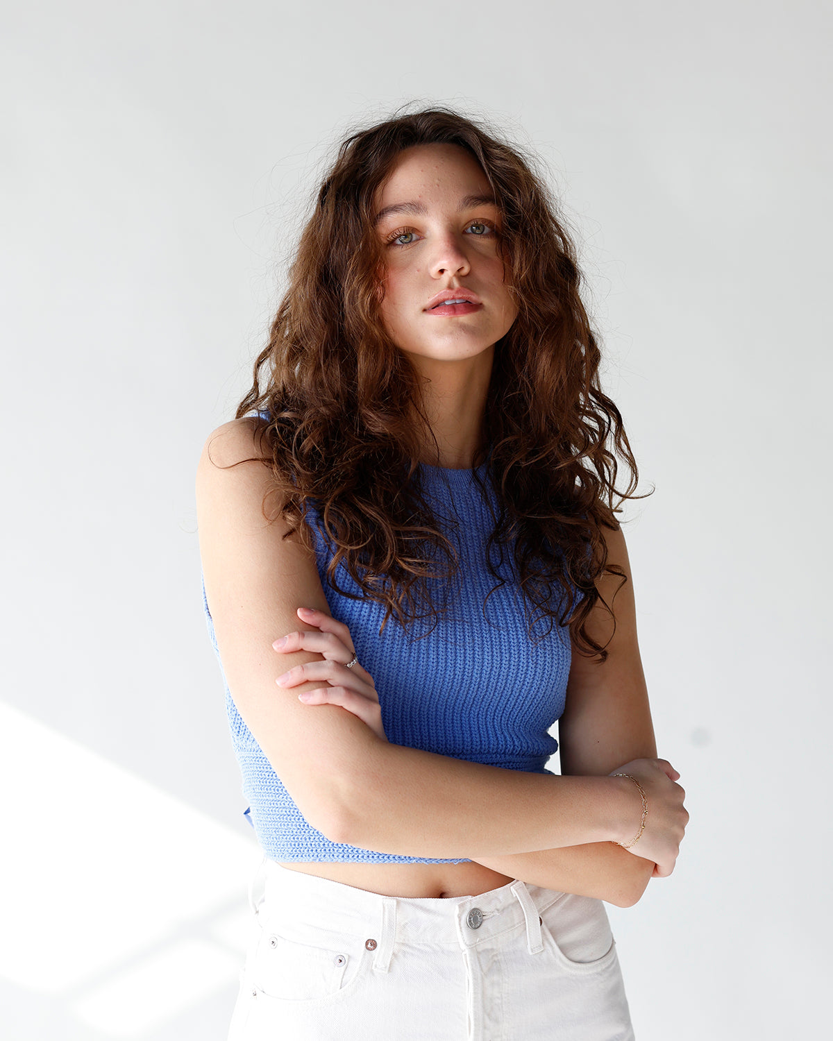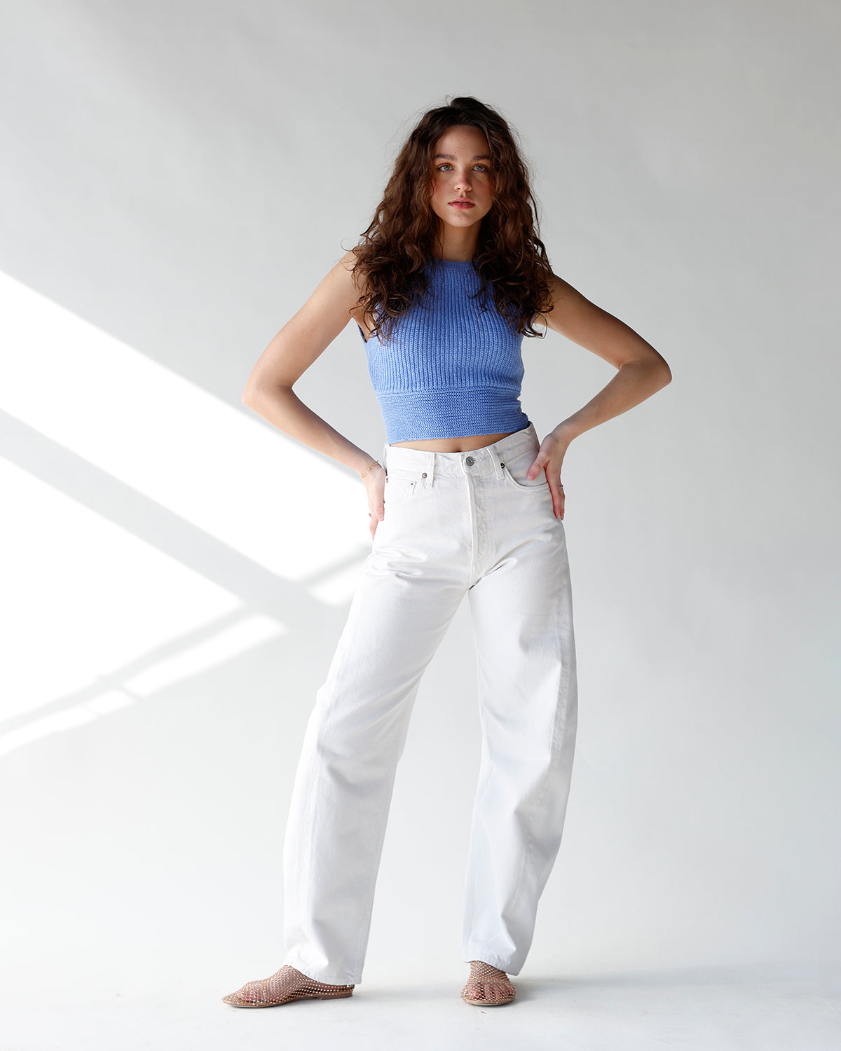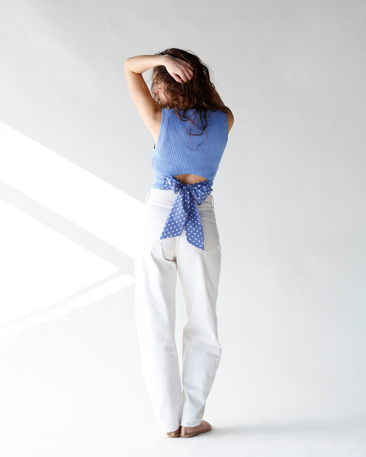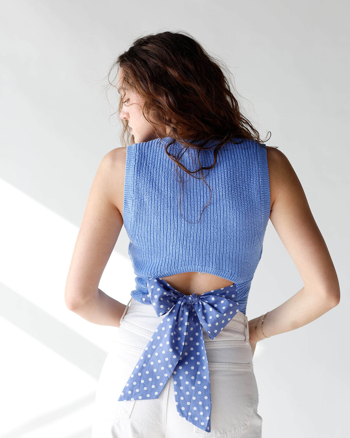 the peek-a-dot darling sweater is playful, flirty, and full of charm. soft blue and sleeveless, it features an open-back peekaboo detail with a sweet blue-and-white polka dot tie that adds the perfect finishing touch. fitted and flattering, it looks adorable paired with high-waisted jeans, skirts, or tailored shorts for brunch, coffee dates, or springtime strolls. cute, comfy, and made to show off just enough playful personality.
