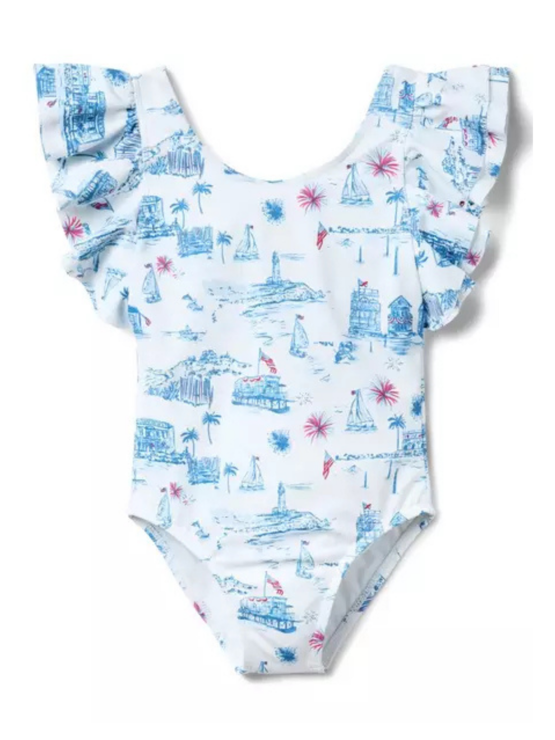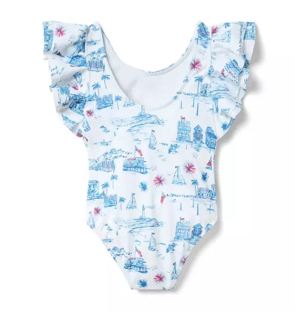 dive into sunny days with our playful one-piece swimsuit, adorned in a charming americana toile. featuring flirty ruffle sleeves and a scoop back, it offers upf 50+ protection to keep little ones safe while they splash. made responsibly from recycled polyester, this fully lined suit is chlorine resistant and perfect for family matching moments. hand wash to keep it fresh and ready for endless summer fun!