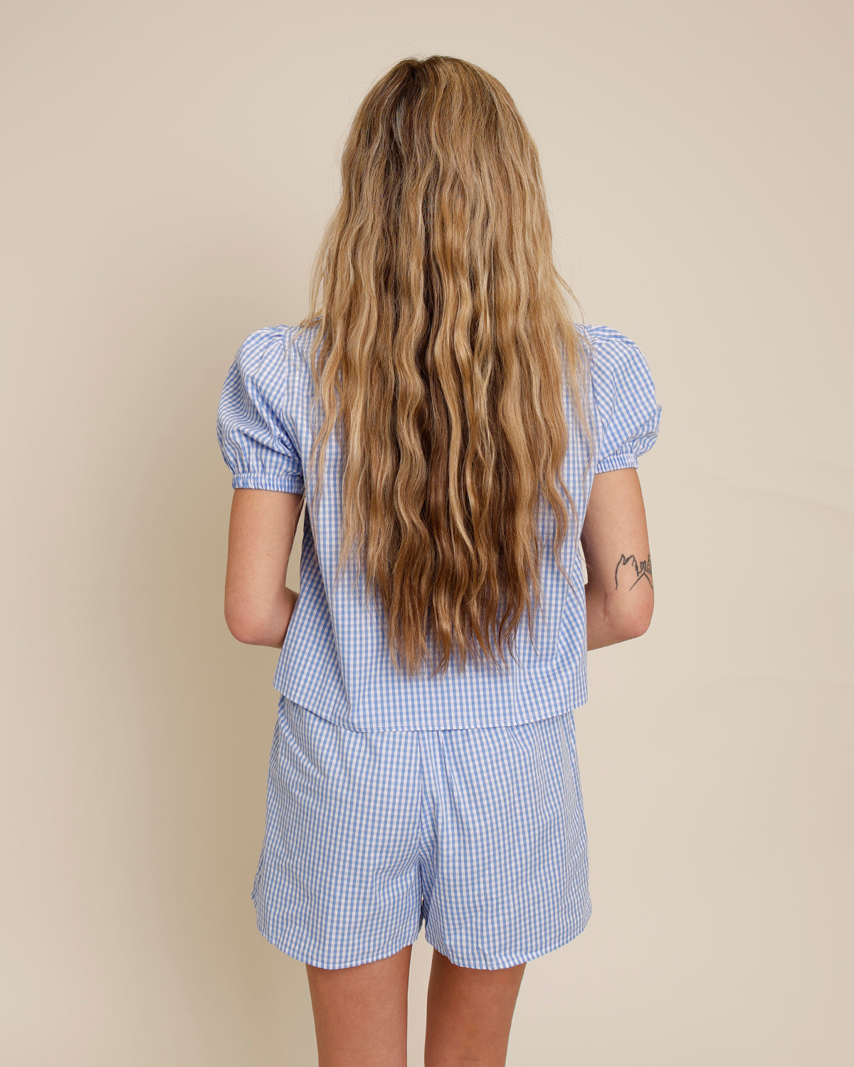 dress up your day with our sunday gingham set. this set features a blue gingham tie front top with puff sleeves and matching elastic waist shorts. perfect for a sunny sunday or any day you're feeling flirty! the perfect effortless and chic set!
