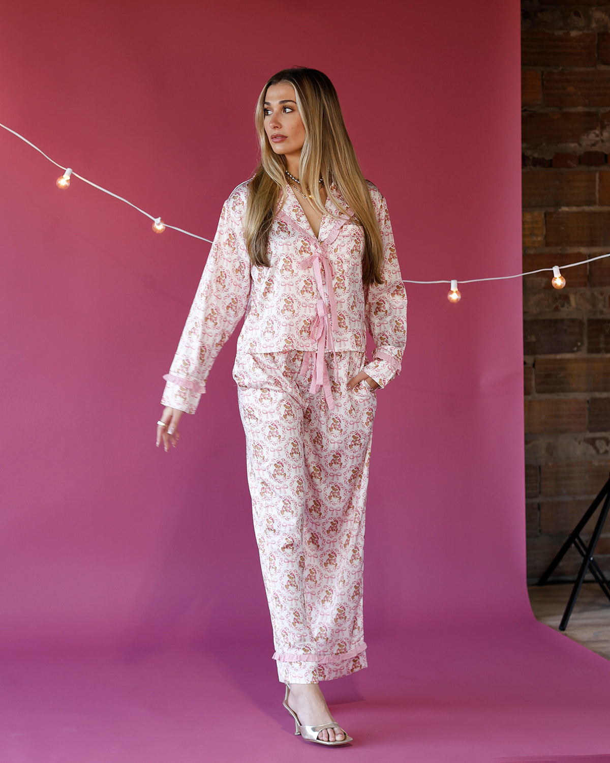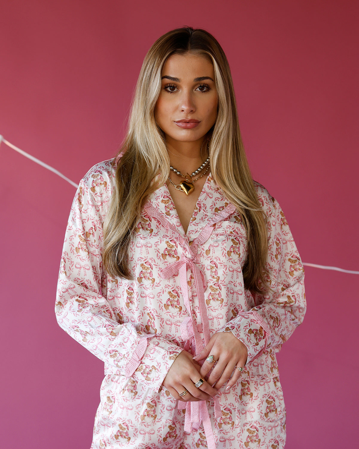 the sweet dreams pajama set is your go-to for cozy, festive holiday mornings. crafted in a soft pink and white print, it features playful teddy bears dressed in pink santa outfits, adorned with tiny gingham bows throughout. the long-sleeve top has a charming collar trimmed in pink gingham, with coordinating bow tie details at the front closure. the matching pants have an elastic waist, side pockets, and are straight-cut for comfortable, easy wear, accented with the same pink gingham bows at the waist for a perfectly coordinated look. ideal for christmas morning, family photos, or snuggly nights in, this set is as cute as it is comfy — the ultimate holiday pajama treat.