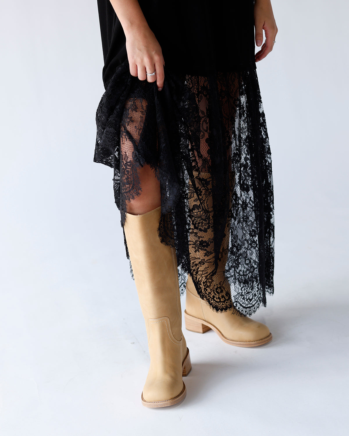 the adeline dress is the perfect mix of cozy comfort and elegant style. it features a relaxed, oversized black t-shirt top that flows seamlessly into a sheer lace skirt with a beautiful midi length, adding just the right amount of drama and feminine flair. the contrast between the soft tee fabric and delicate lace makes this dress effortlessly cool while still feeling special and refined. style it with chunky ankle boots and a leather jacket for an edgy, street-style look, or dress it up with strappy heels and layered gold jewelry for a night out that turns heads. for a casual daytime vibe, pair it with white sneakers and an oversized cardigan or denim jacket — ideal for brunch dates or laid-back weekends. versatile and chic, the adeline dress is your go-to for everything from relaxed days to special occasions. it’s all about effortless style that keeps you comfortable and confident, making it a must-have in any wardrobe.