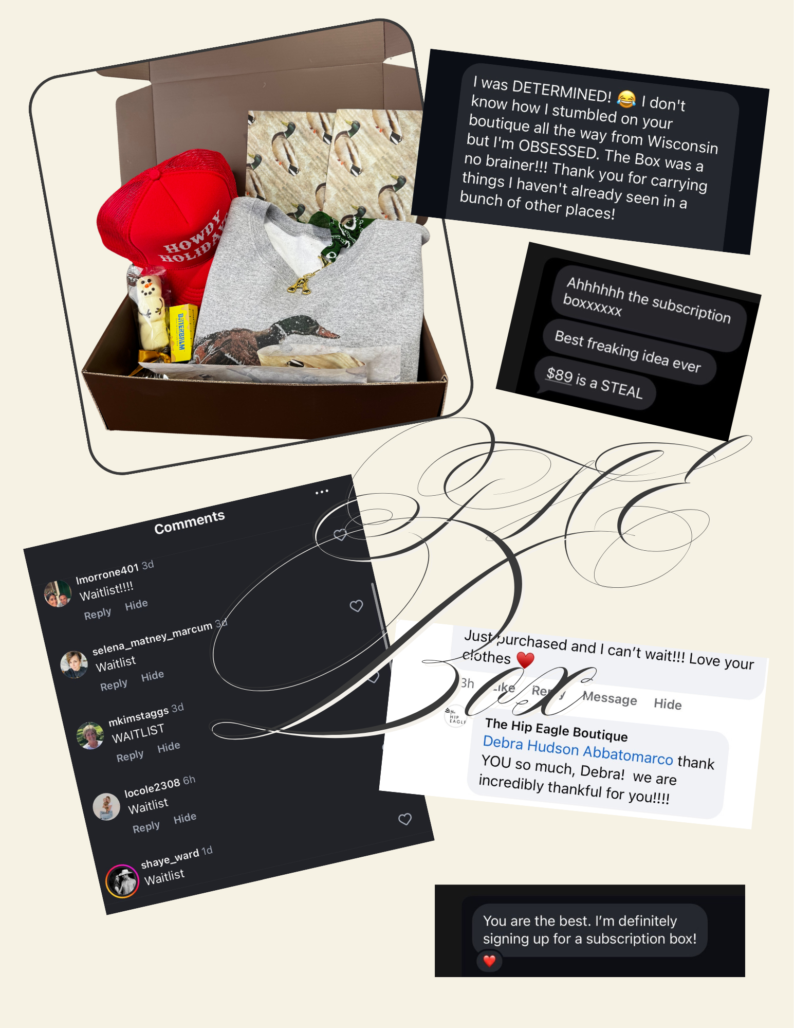 THE BOX:: a monthly subscription created for HIP hunnies, curated by our owner, maggie. styles you'll wear first, everyone else will copy late! exclusive styles, favorite accessories and/or things we know you need before you know you need them! limited access, high impact looks. ready for the box everyone wishes they'd gotten??? let us do the work, you do the SOARING!