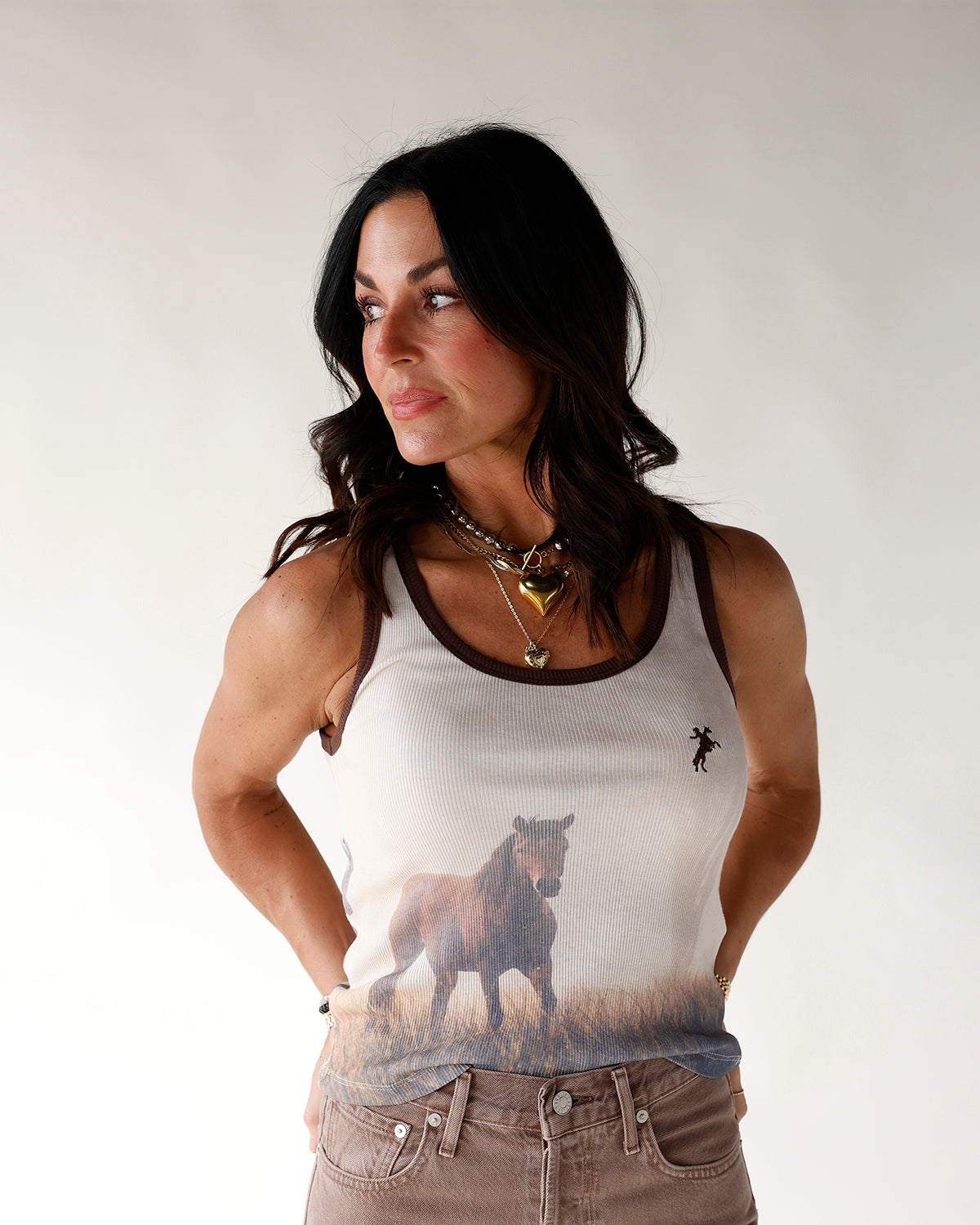 meet the wild west ribbed tank top, a soft statement essential with western edge. crafted from a breathable super modal baby rib knit, this fitted tank combines the comfort of cotton with the silky smooth feel of modal for an ultra-flattering fit. the prairie-inspired horse graphic wraps around the front, sides, and back for a bold, immersive design that captures true ranch energy from every angle. style it with high-rise denim and boots for an effortless everyday look, or pair it with cutoffs and layered jewelry for a laid-back outfit that feels cool, confident, and easy.